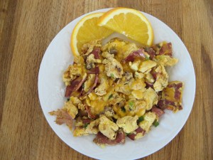 In a small non-stick frying pan, fry turkey bacon on medium heat. When it is about half way cooked, add the vegetables to the pan and sauté until tender. Add egg substitute and scramble until done. Turn heat to low, sprinkle cheese on top, cover with a lid until the cheese melts.