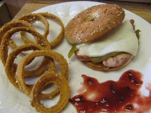 At Costco I bought a bottle of Roasted Raspberry Chipotle Sauce. On the bottle it is described as a southwestern mesquite sauce. We have found that we LOVE this sauce! Ken uses the Sandwich Thins for his and I like the Everything Bagel Thins. We have used both chicken tenders and even turkey hot dogs.