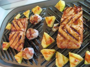 Last night Ken mixed 2/3 of this sauce with 1/3 BBQ sauce and basted it on salmon steaks. He sprinkled the salmon with garlic granules and Bon Appetit seasoning. In addition to the salmon, he also grilled some scallops and pineapple with the same sauce. The entire meal was SO delicious!!!