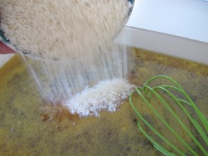 Add rice. Distribute rice as evenly as possible. (I look at the side of the pan to see the rice to make sure that it is as even as possible.)