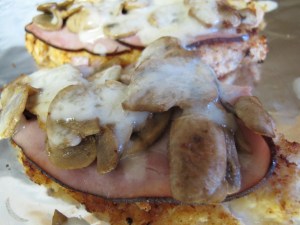 Place chicken on foil-lined cookie sheet, top with ham, mushrooms and cheese. (This is just two chicken breasts – pounded down. Big serving for one meal or split it in two for half the points!)