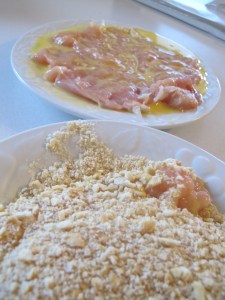 Place one chicken breast at a time, in a zip lock bag. Pound with the smooth side of a meat mallet. Flatten chicken to 1/4 inch thickness.