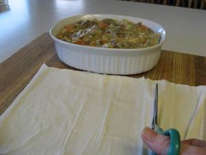 Lay dough on top of chicken mixture. Tuck in the sides. Spray with I Can’t Believe It’s Not Butter spray.
