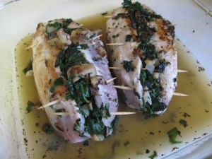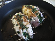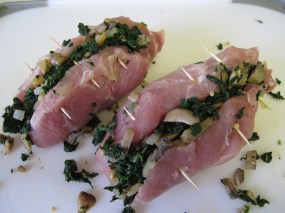 Trim any fat off of the pork chops. Cut a pocket into each pork chop and stuff with the spinach mixture. Secure with toothpicks.
