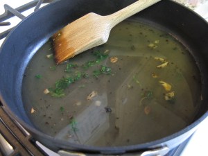 Add chicken broth and wine/apple juice to the skillet. Stir for a minute to collect any drippings from the pan.
