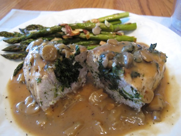 SPINACH STUFFED PORK CHOPS pictured with Oven Roasted Asparagus – recipe in this blog.