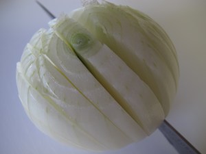 Turn onion on its side and slice – the onion magically falls into nice little pieces. Ta – Da!