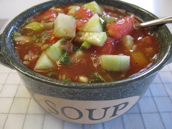 Gazpacho is a cold fresh vegetable soup. So delicious on a hot summer day.