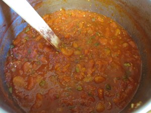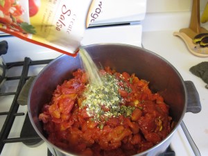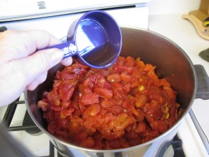 If you like your salsa chunky, cut you tomatoes even bigger than shown above. I found it best to squeeze as much of the juice out of them before starting to cook them. This cuts down your cooking time. The bag says to use 6 pounds of tomatoes. I weighed them after I squeezed the juice out. I have used between 7 pounds and 11 pounds of tomatoes and it doesn’t really make a difference. The 11 pound batch is a bit more mild than the 7 pound batch. I just used what I had at the time.