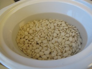 Place dry beans in a crock pot (turned off) and cover with water. Soak beans overnight, or at least 8 – 12 hours. Make sure there is enough water to allow for the beans to triple in size.