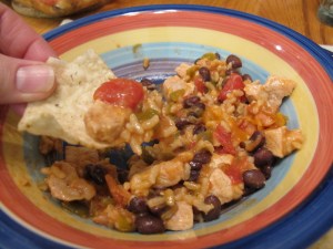 We ate thiswith with the tortilla chips the first night and then ate the leftovers wrapped in a tortilla shell, with refried beans and a little Chile Verde on top the next night. (Recipe for Chili Verde will be coming to you soon!)