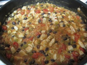 Stir in black beans, tomatoes, soup, chilies, brown rice, water and salsa.