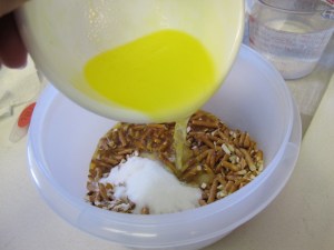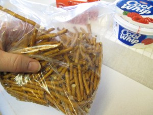 I find it easiest to put pretzels in a zip-lock bag and crush them with a mug or side of a meat tenderizer mallet. Measure out 2 cups – trying not to include too much of the dusty salty parts.