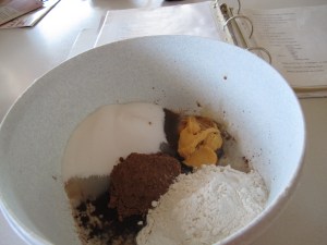 Mix sugar, oil, eggs, and vanilla until well blended. Add cocoa, flour, baking powder and salt. ( That yellow glob is the powdered egg mixed with a little water)