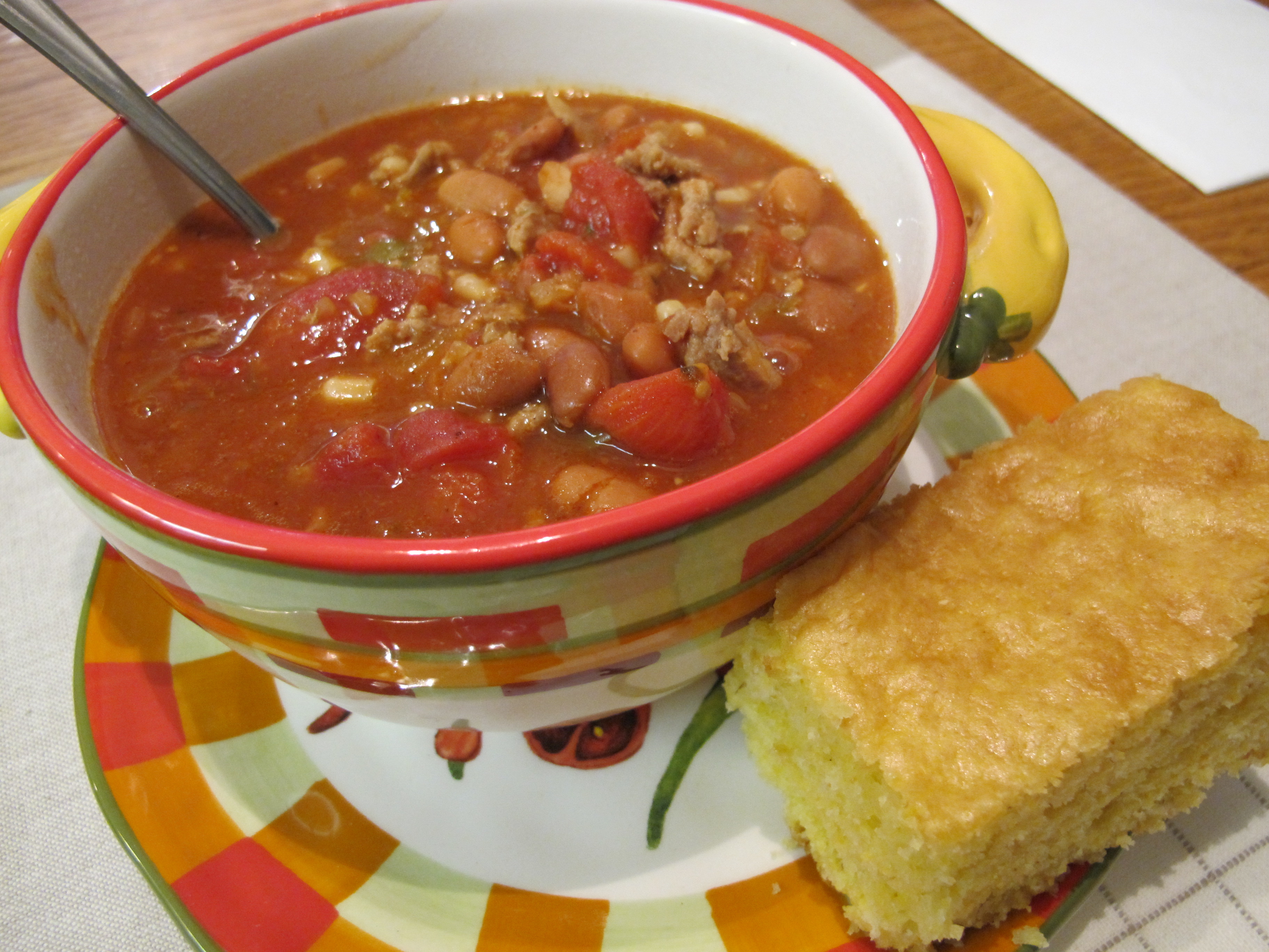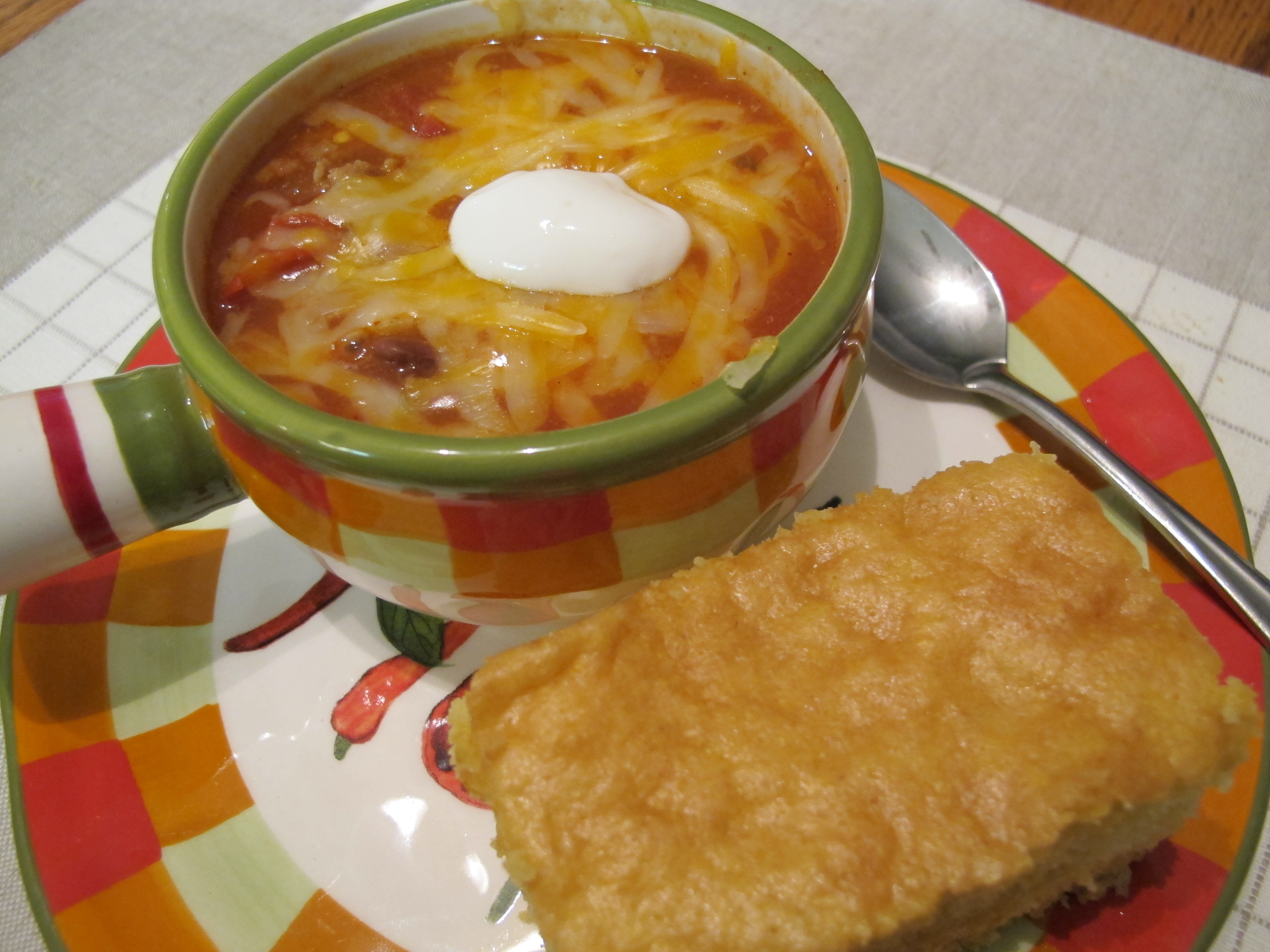 On our way to California for Christmas, we stopped at Janet Gutierrez’s home.  She had this wonderful pot of soup simmering in the crock pot and was kind enough to invite us for dinner.  It is a cross between Taco Soup and Chili, since it has beans in it.  She served it with the best corn bread – Sweet Corn Bread (found in this blog under the Bread tab).  Together they made a most delicious meal.