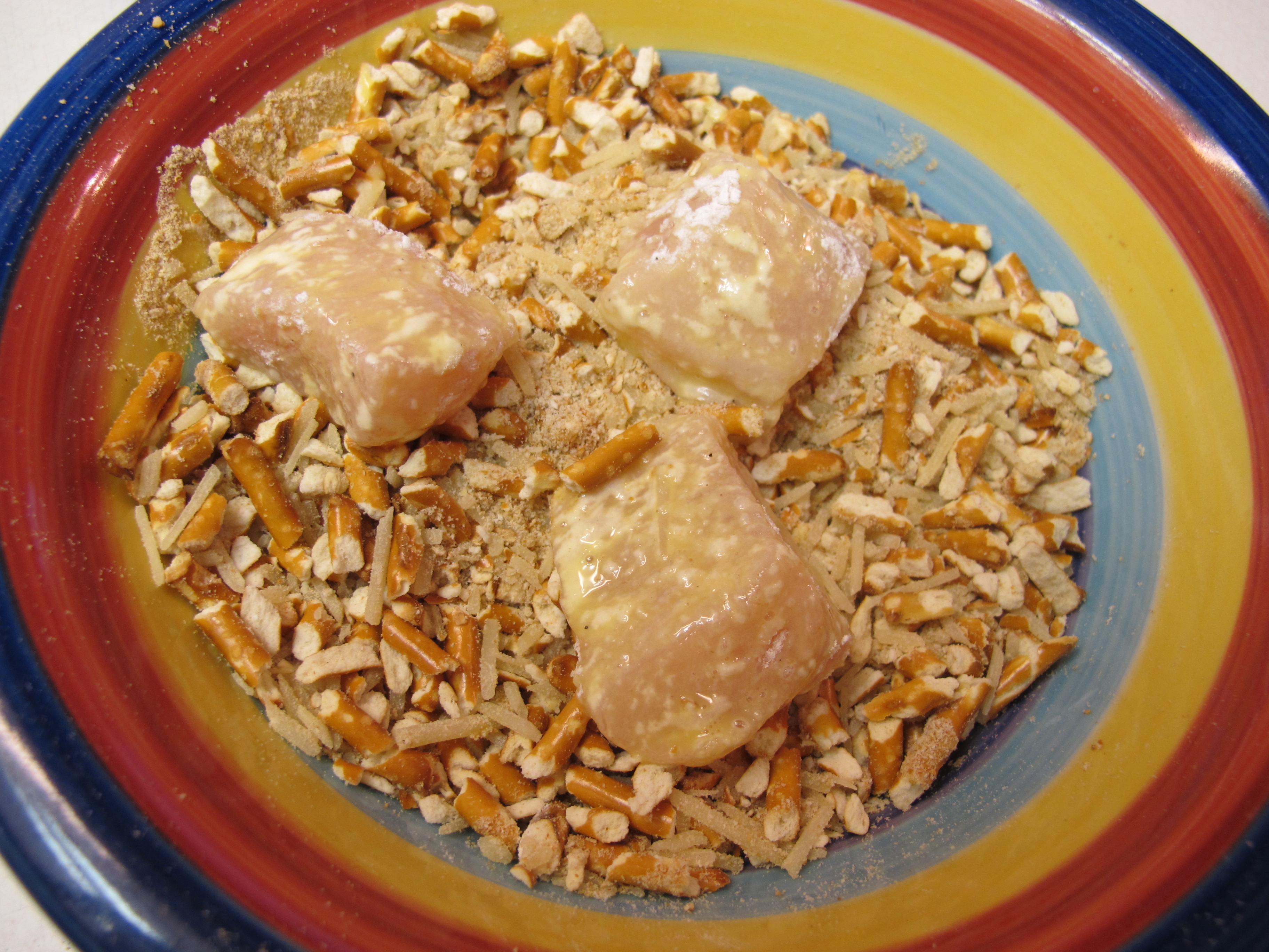 Roll a chicken piece in flour mixture until thoroughly coated. Dip in egg, allowing excess to drip off. Transfer to pretzel mixture and turn until thoroughly coated. Place on baking sheet. Repeat with remaining pieces of chicken.