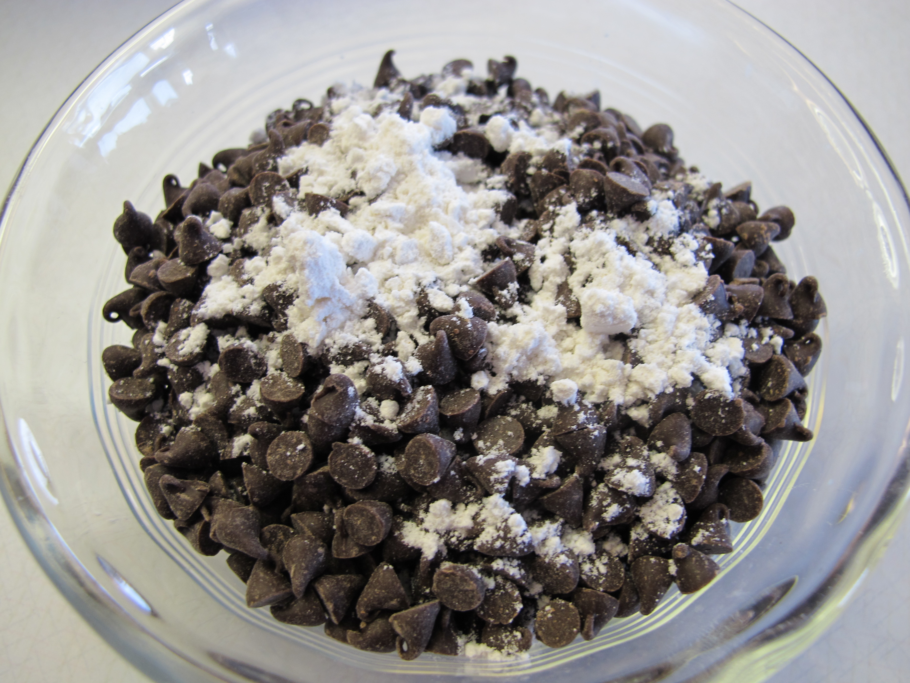 Add a teaspoon or two of this flour to the chocolate chips. Doing this helps keep the chips suspended within the batter and keeps them from sinking to the bottom.