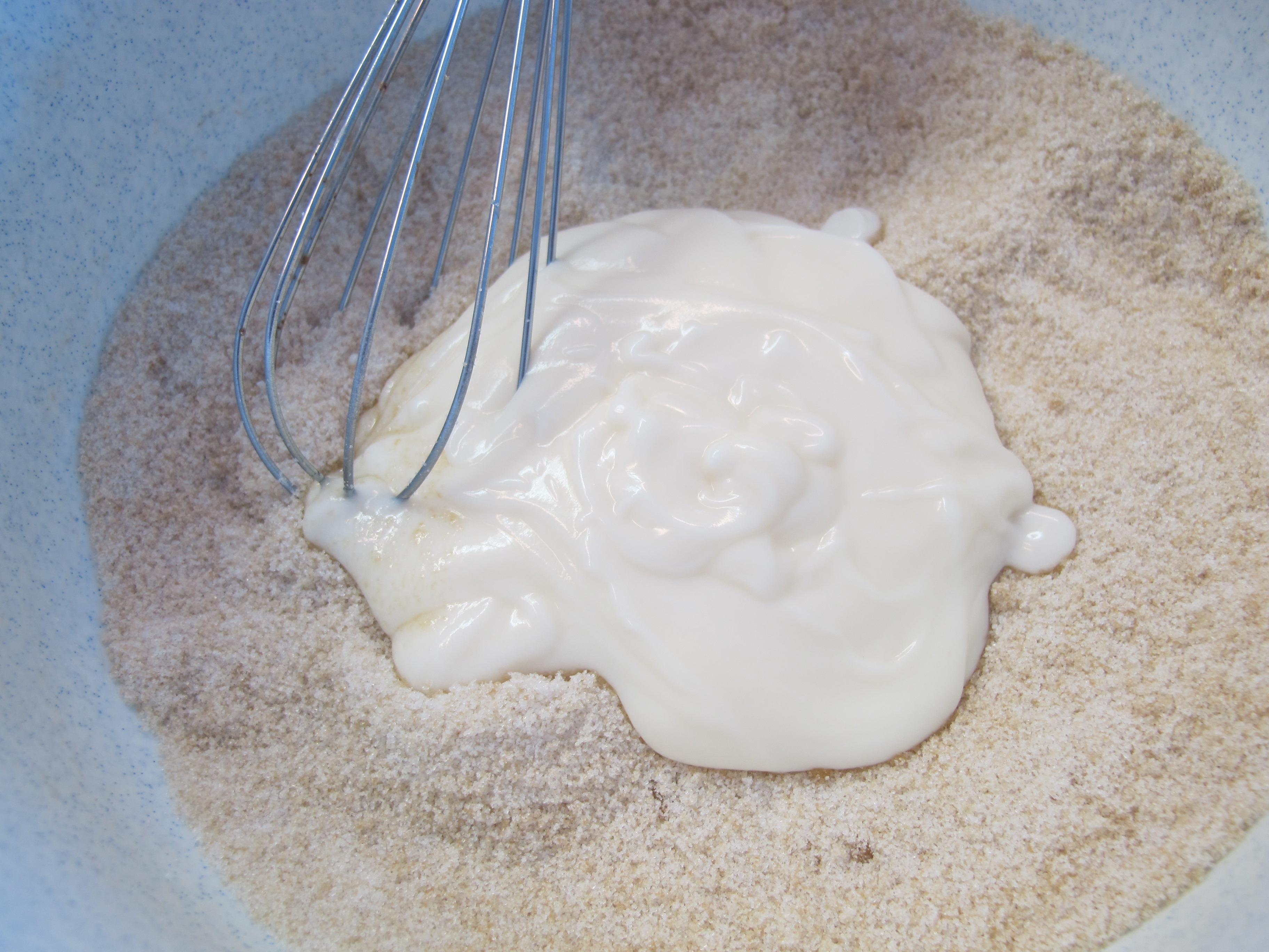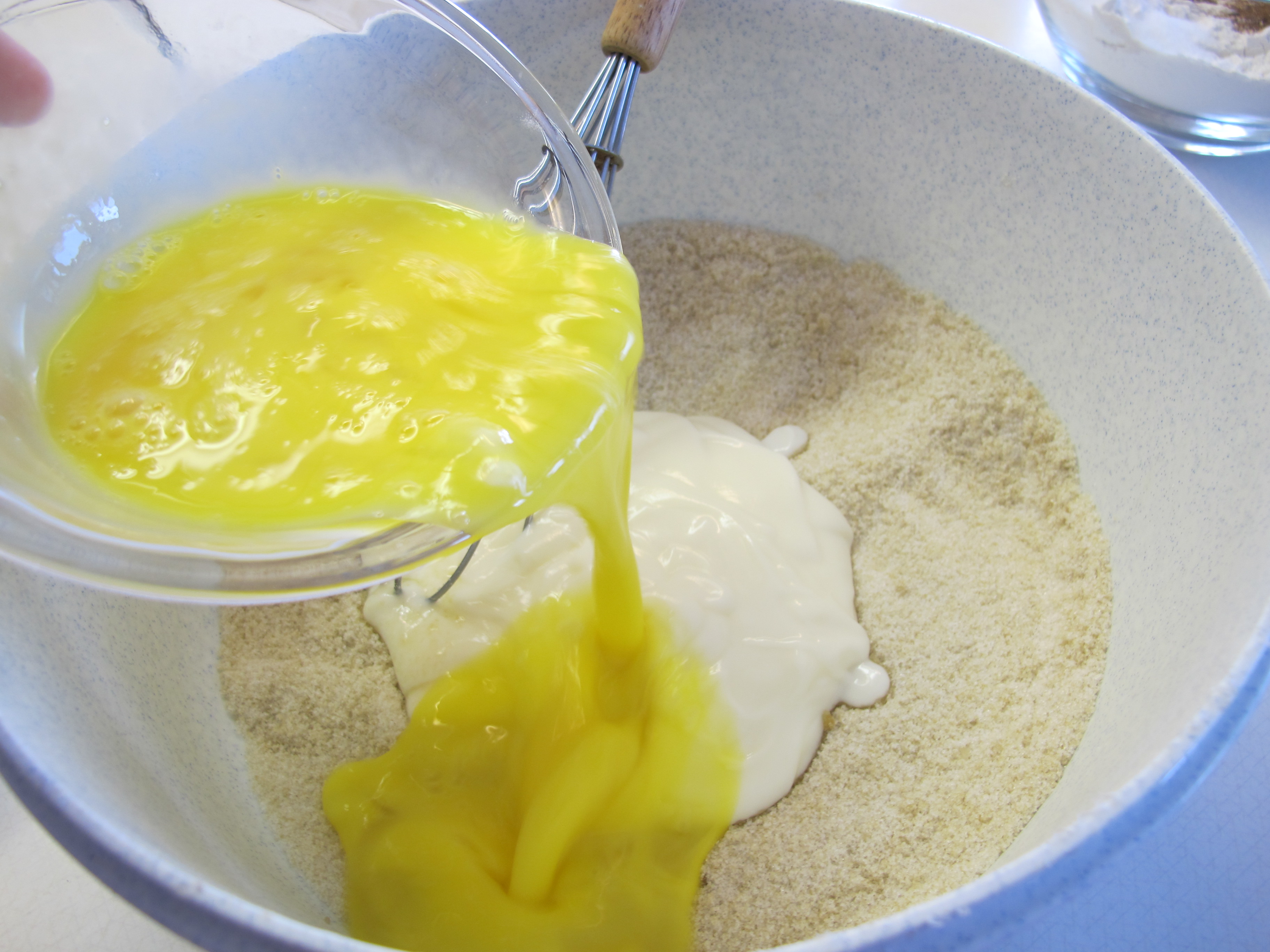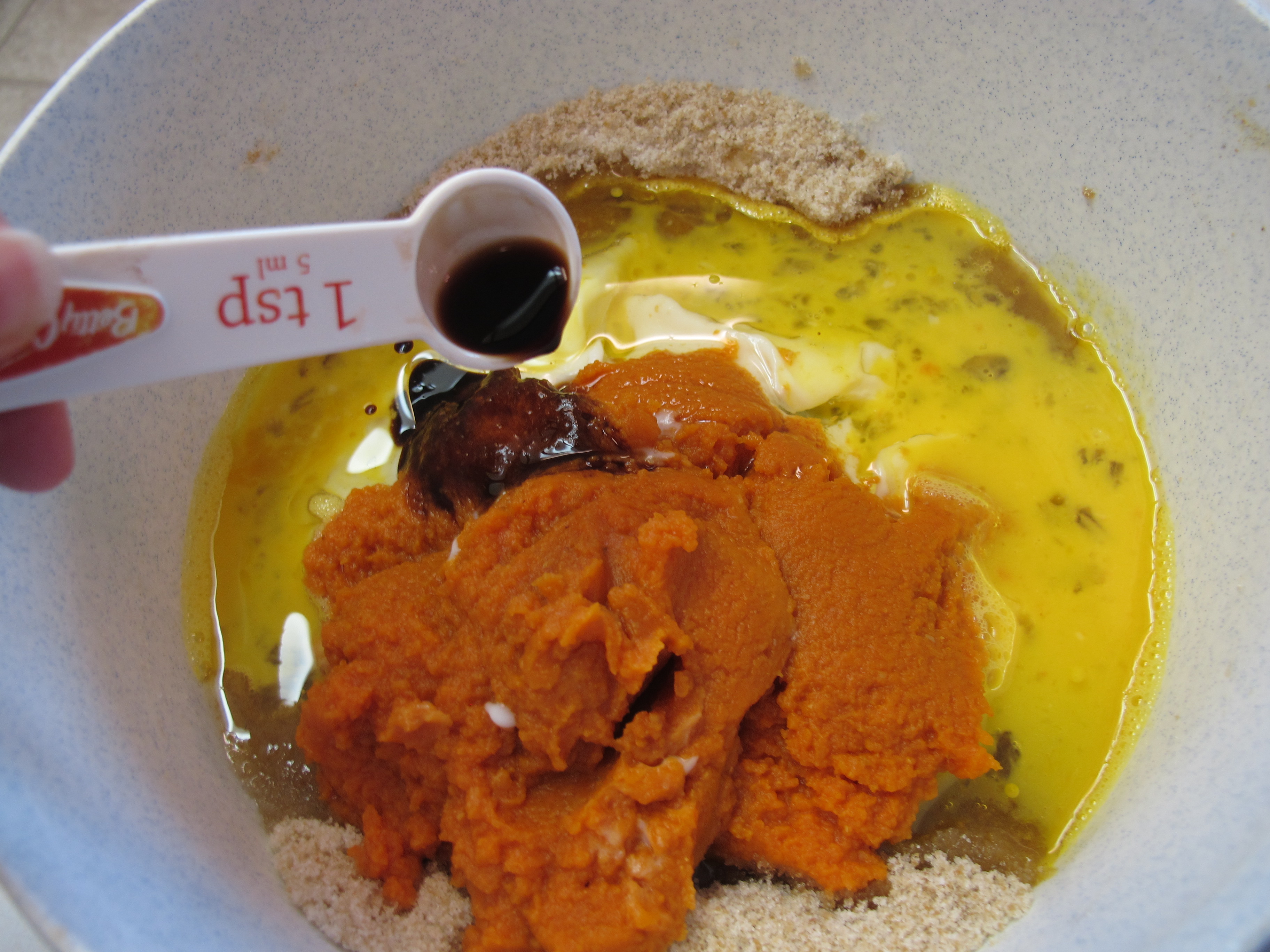 Add yogurt, eggs, pumpkin, oil, and vanilla extract. Whisk until smooth.