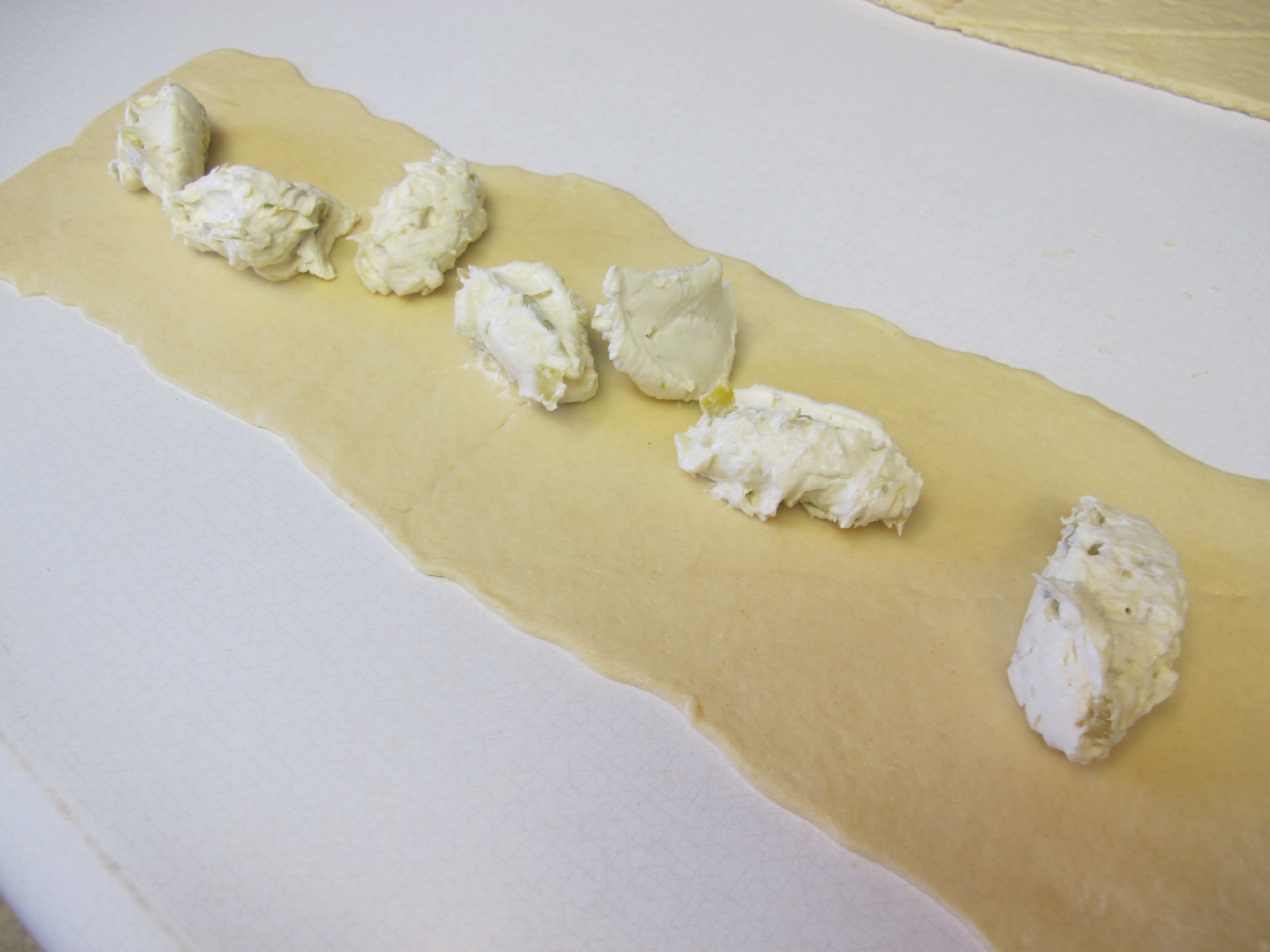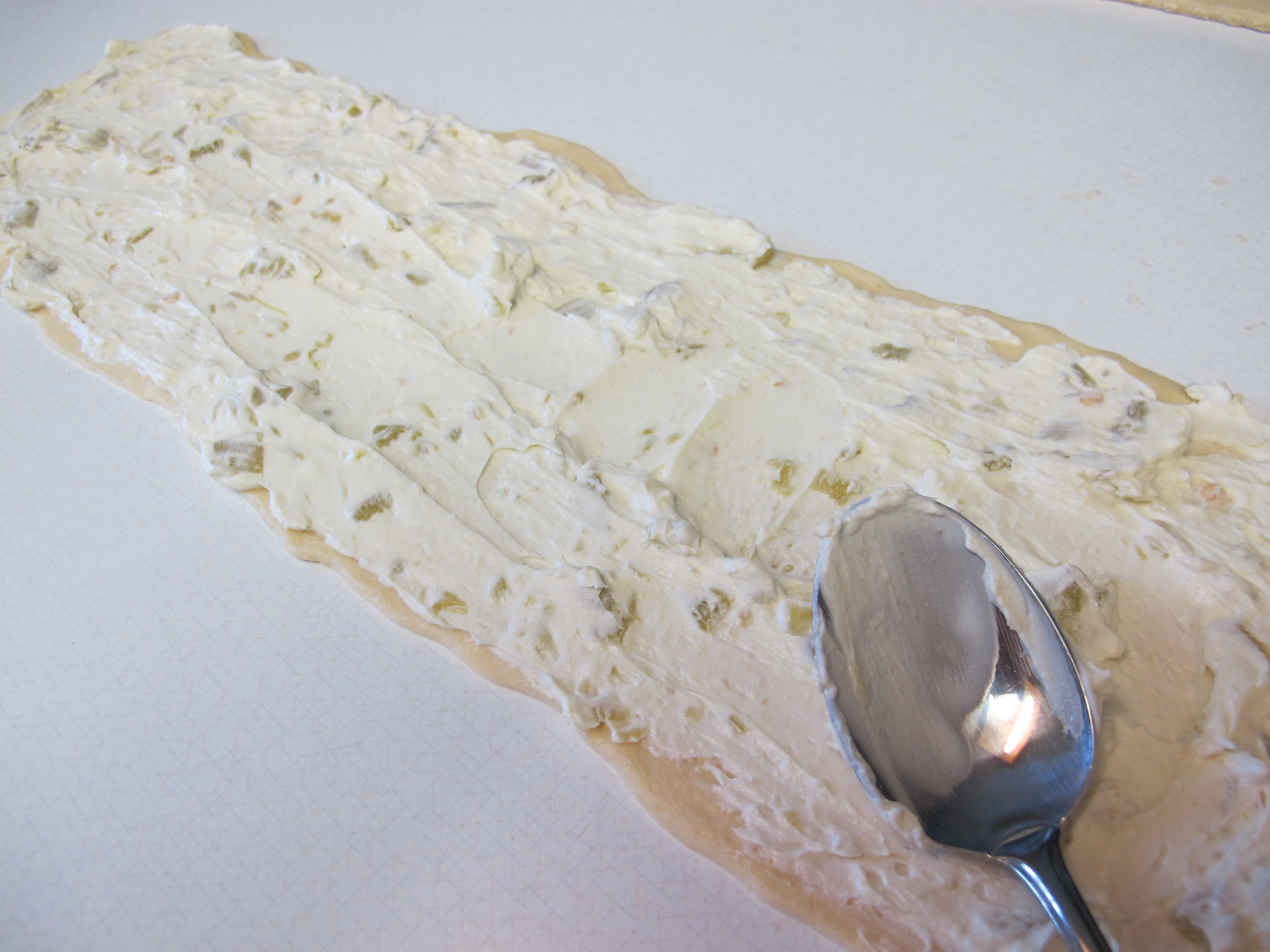 With the back of a spoon, spread half of the cream cheese mixture onto one of the rectangles. Save the other half of the mixture for the other rectangle.