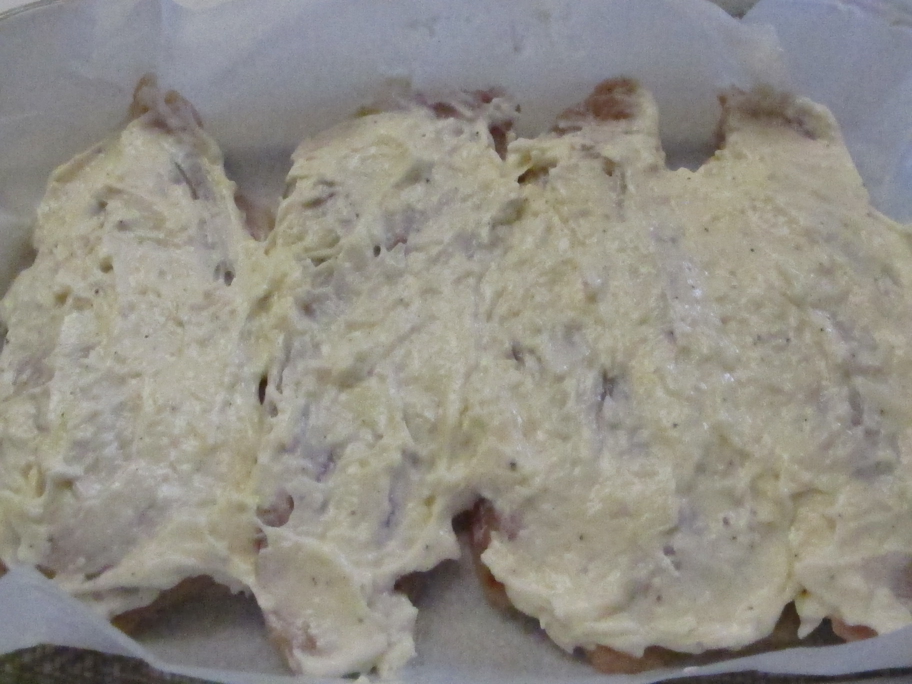 Lay chicken fillets in a shallow casserole pan. I lined the pan with parchment paper for easy clean up.