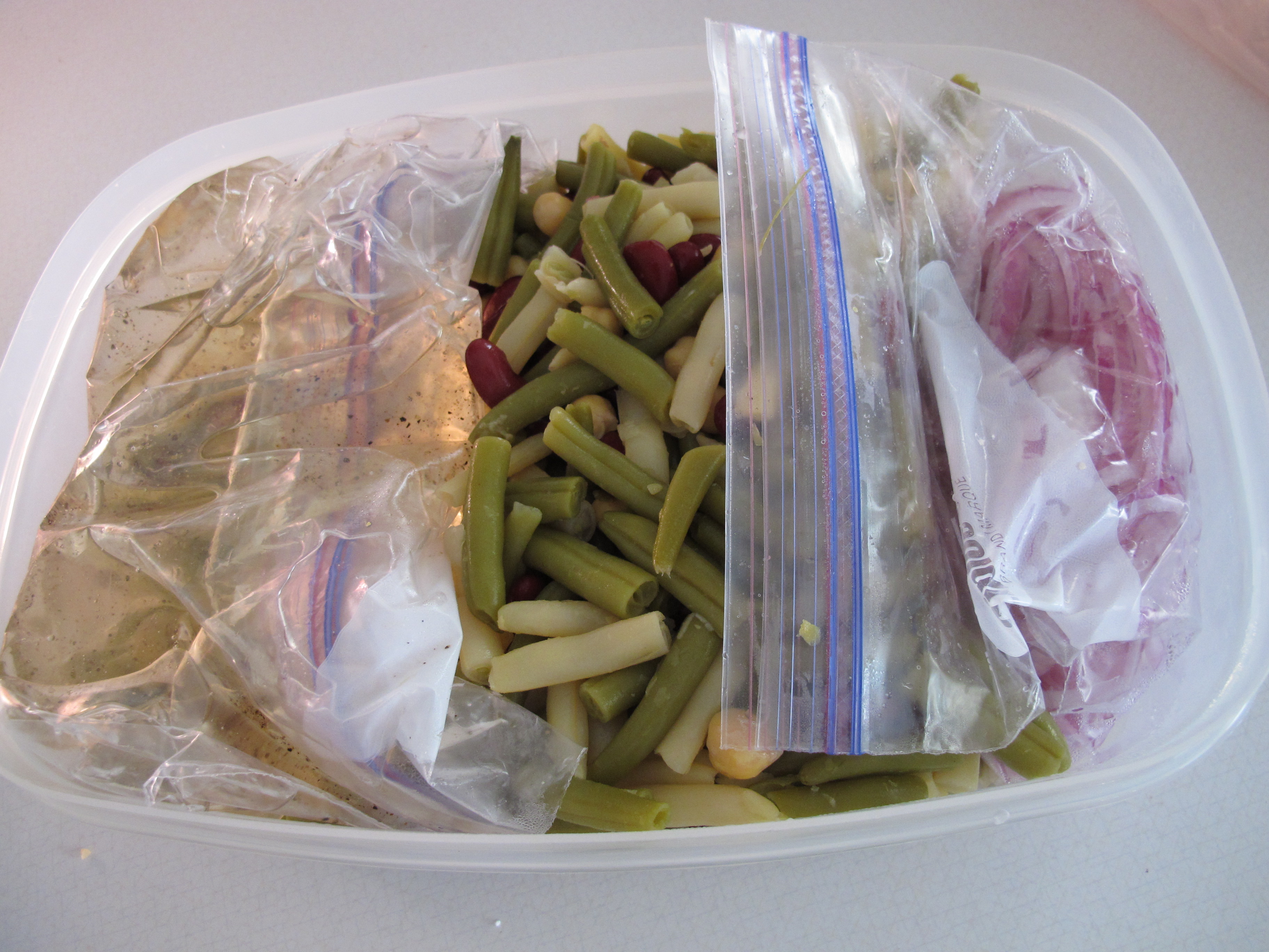 Place the bag of onions and dressing in the same container as the beans.