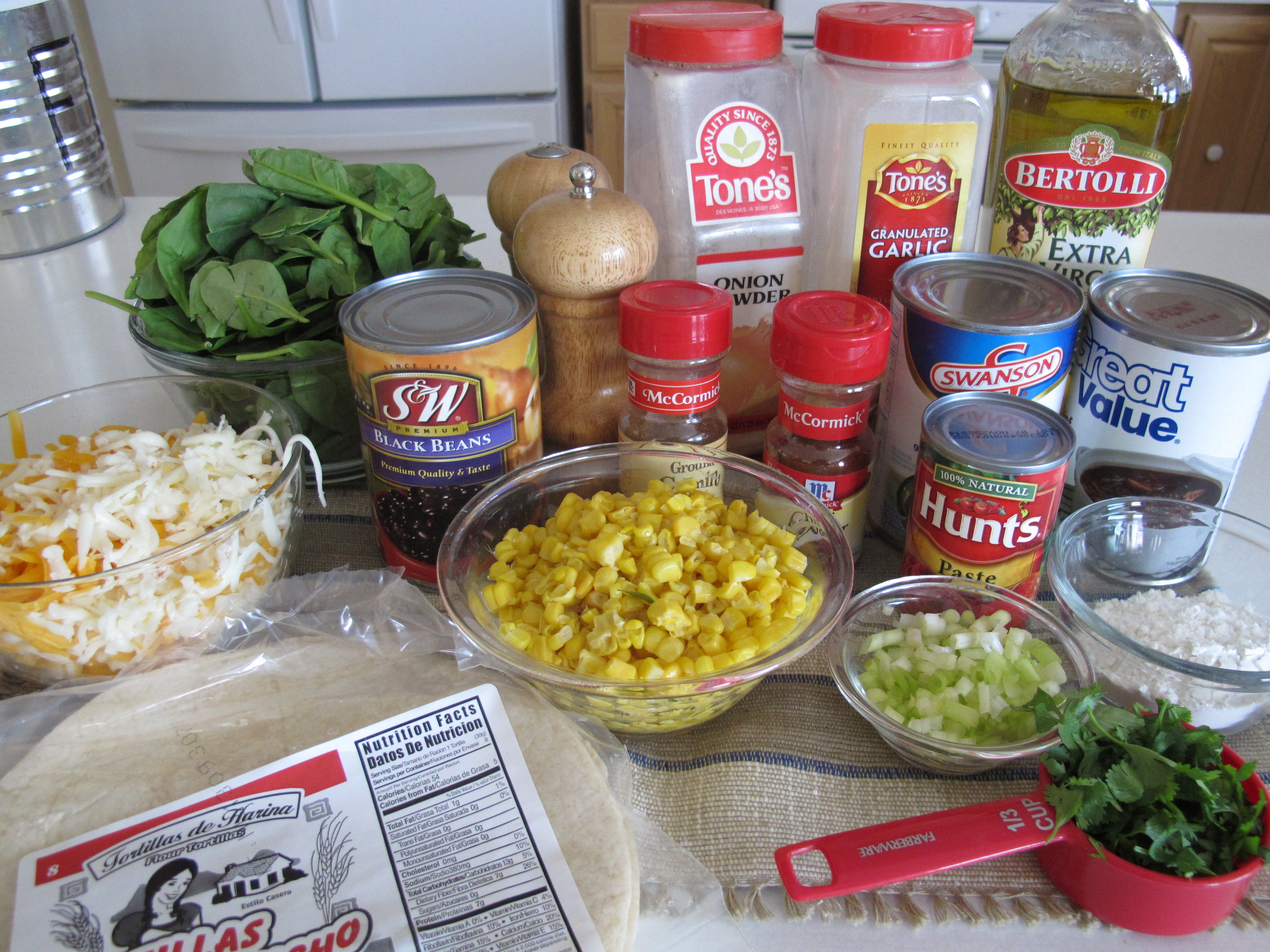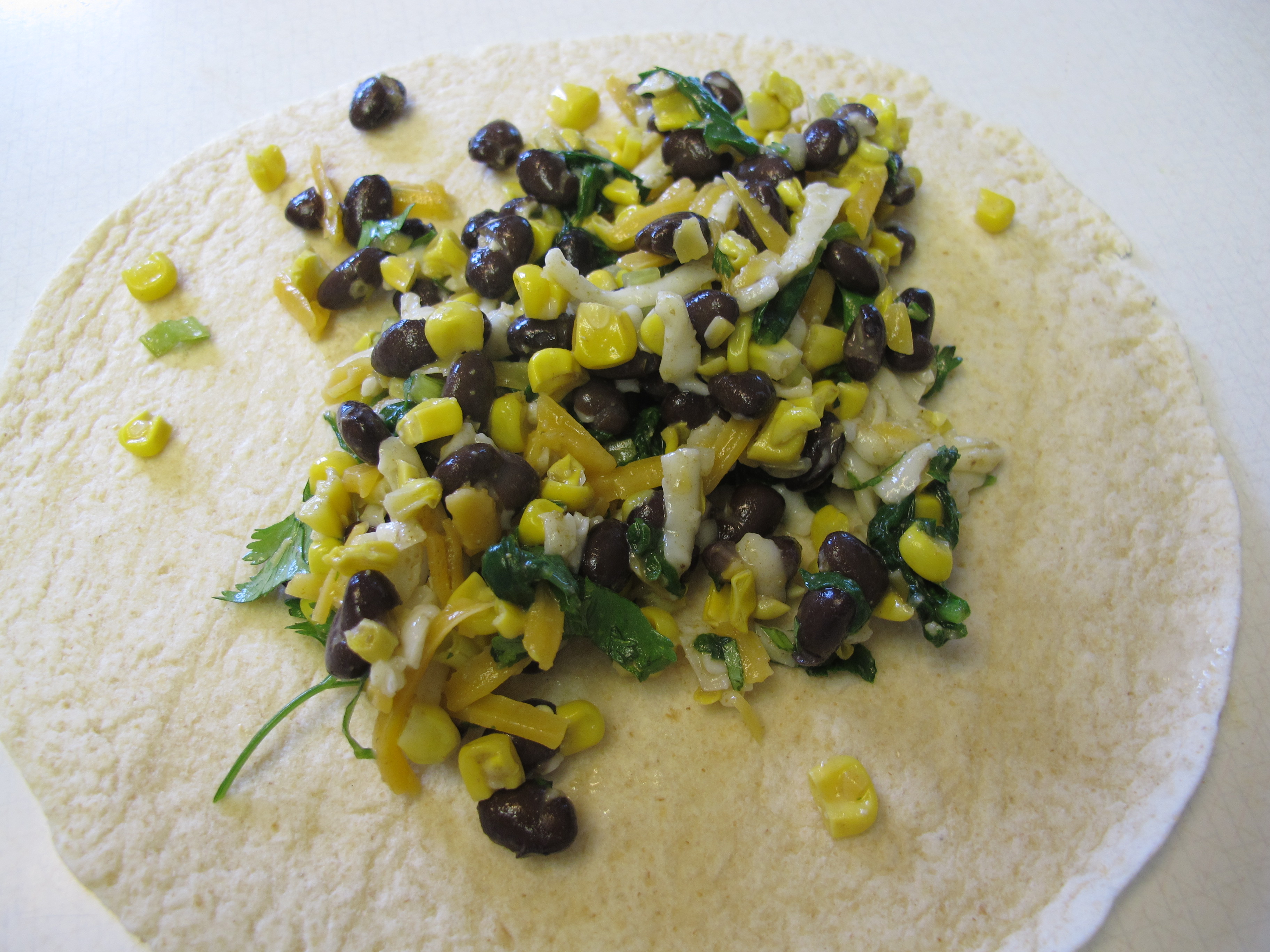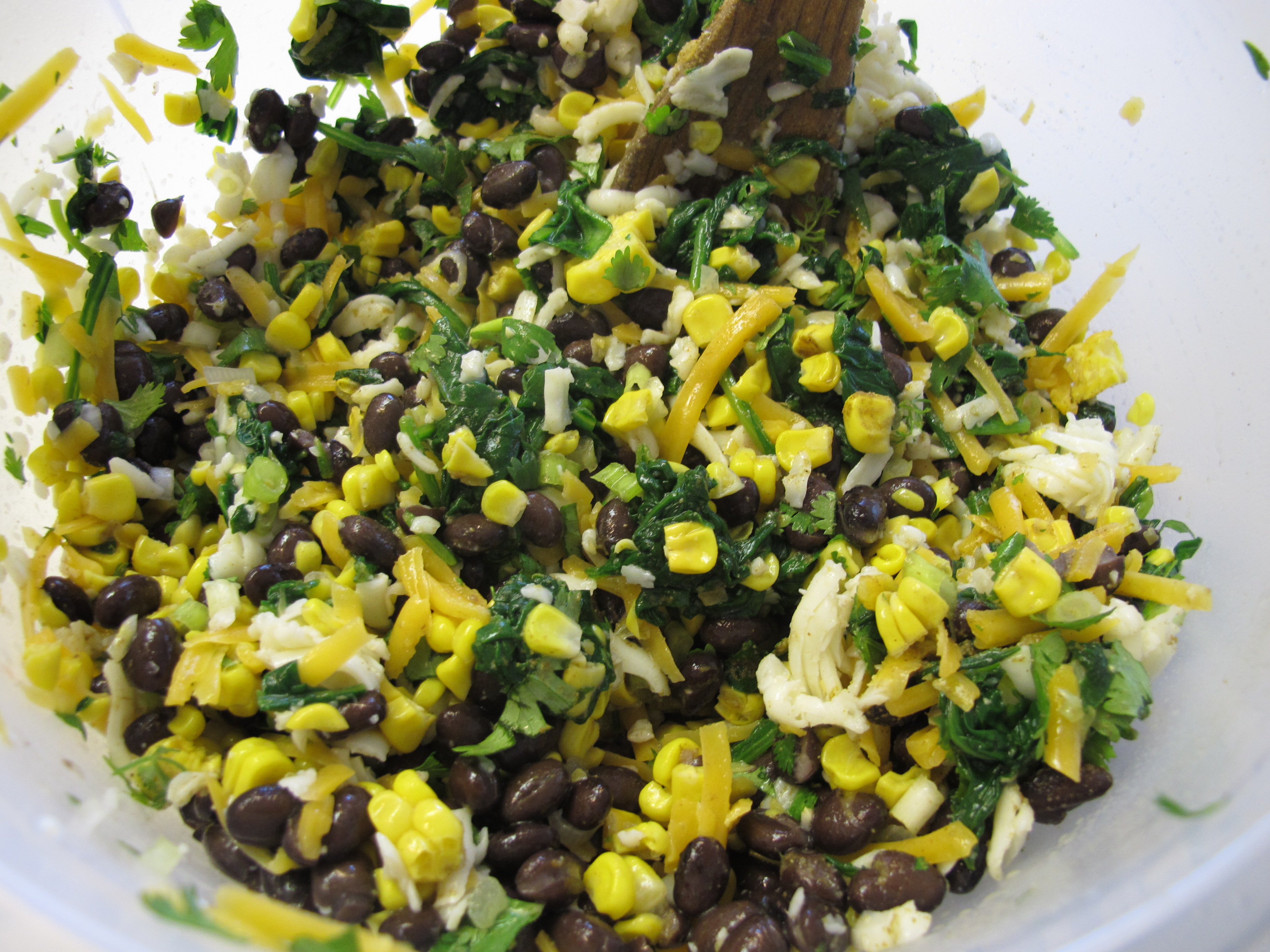 In a large bowl, combine the black beans, corn, green onions, cilantro, cumin and 2 cups of the cheese.