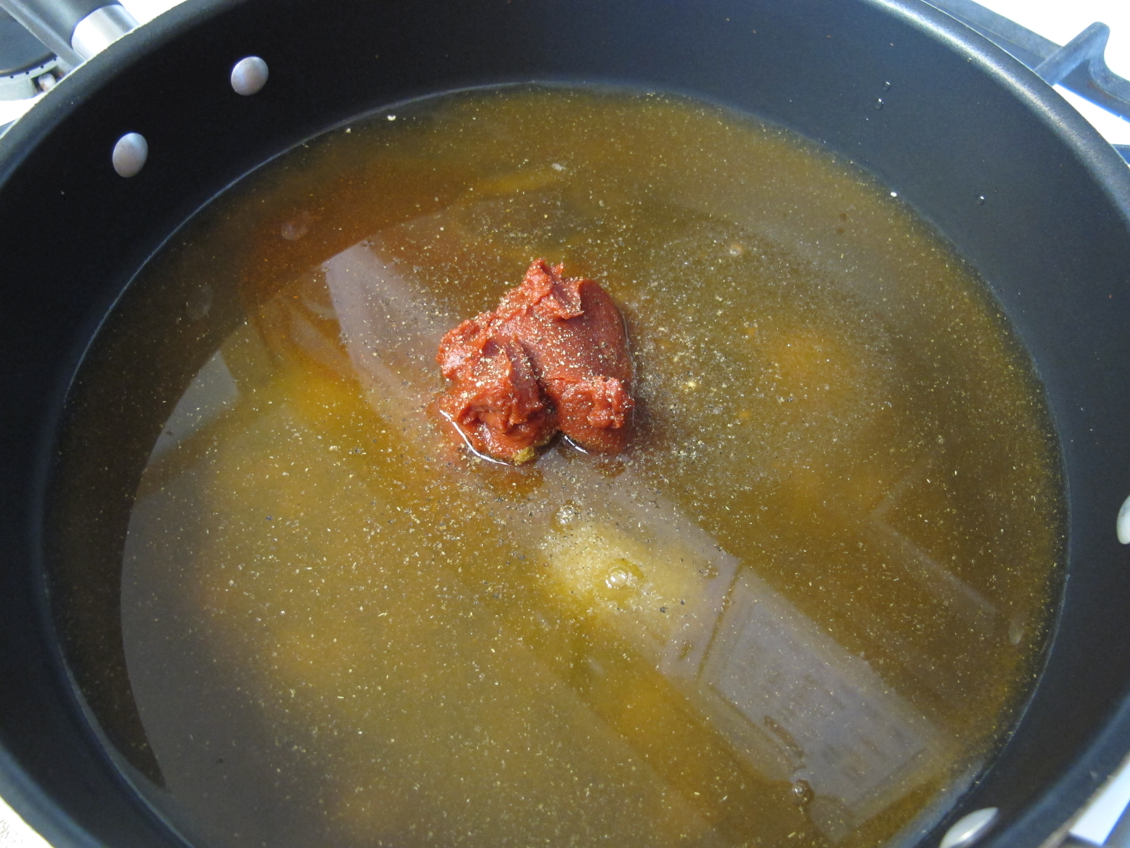 In a skillet, mix the remainder of the broth with the tomato paste, cumin, garlic powder, onion powder and chili powder.