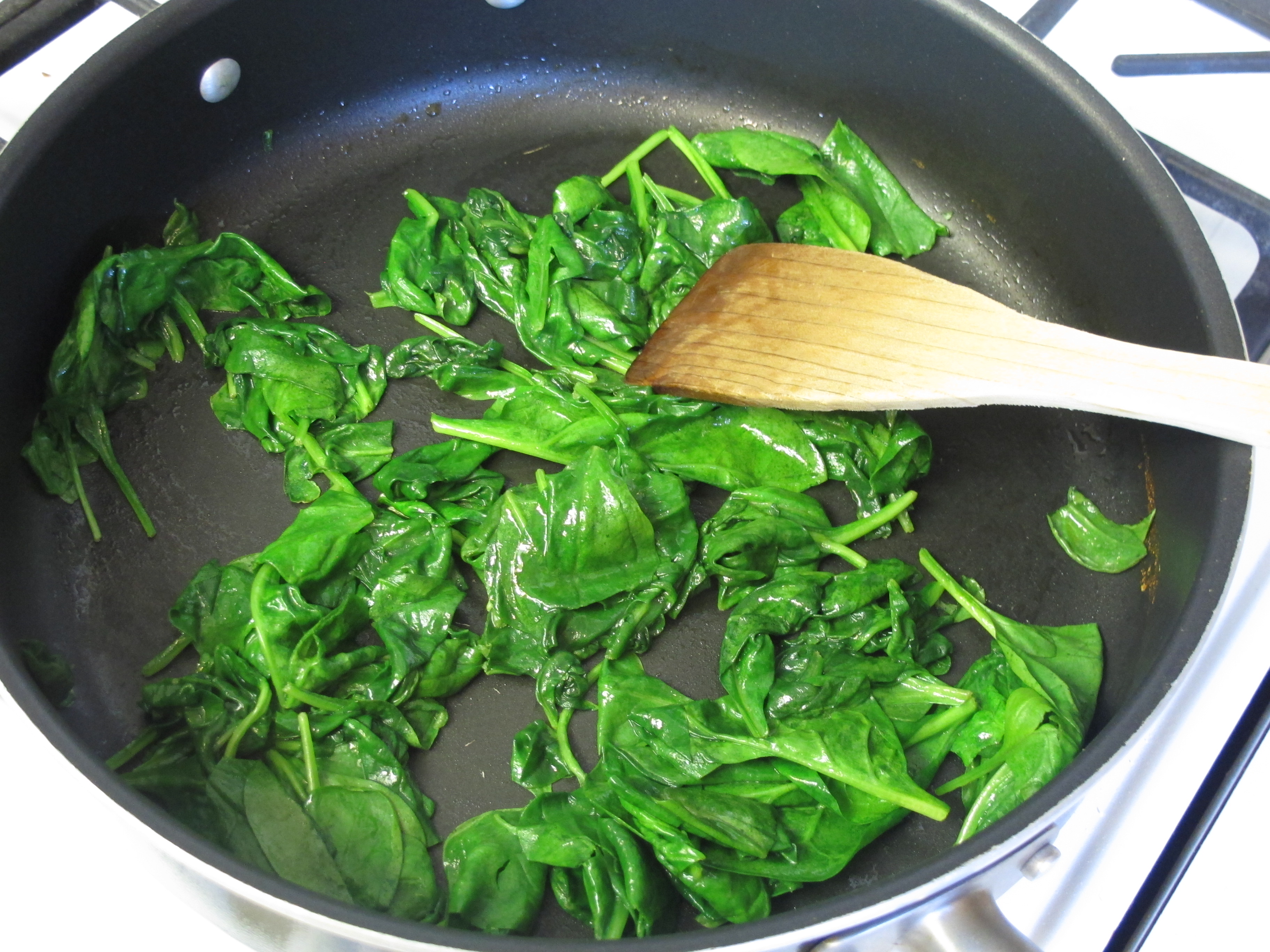 In the same skillet, heat the olive oil and quick saute the spinach over medium heat for 1 -2 minutes until slightly wilted.