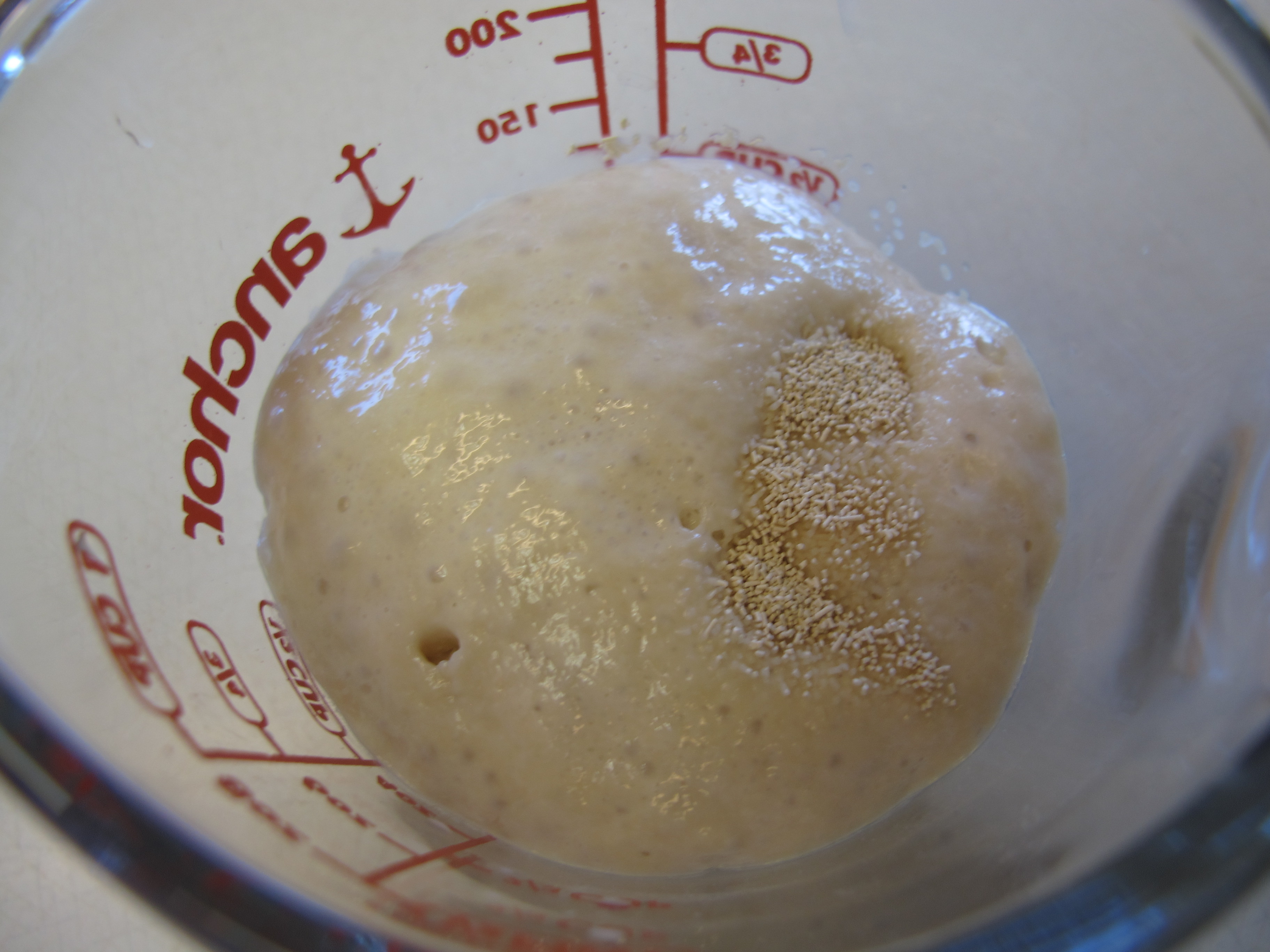 Combine 1/4 cup sugar, milk, yeast mixture, and enough flour (about 1 1/2 cups) to make a medium batter (about the consistency of pancake batter). Beat thoroughly.