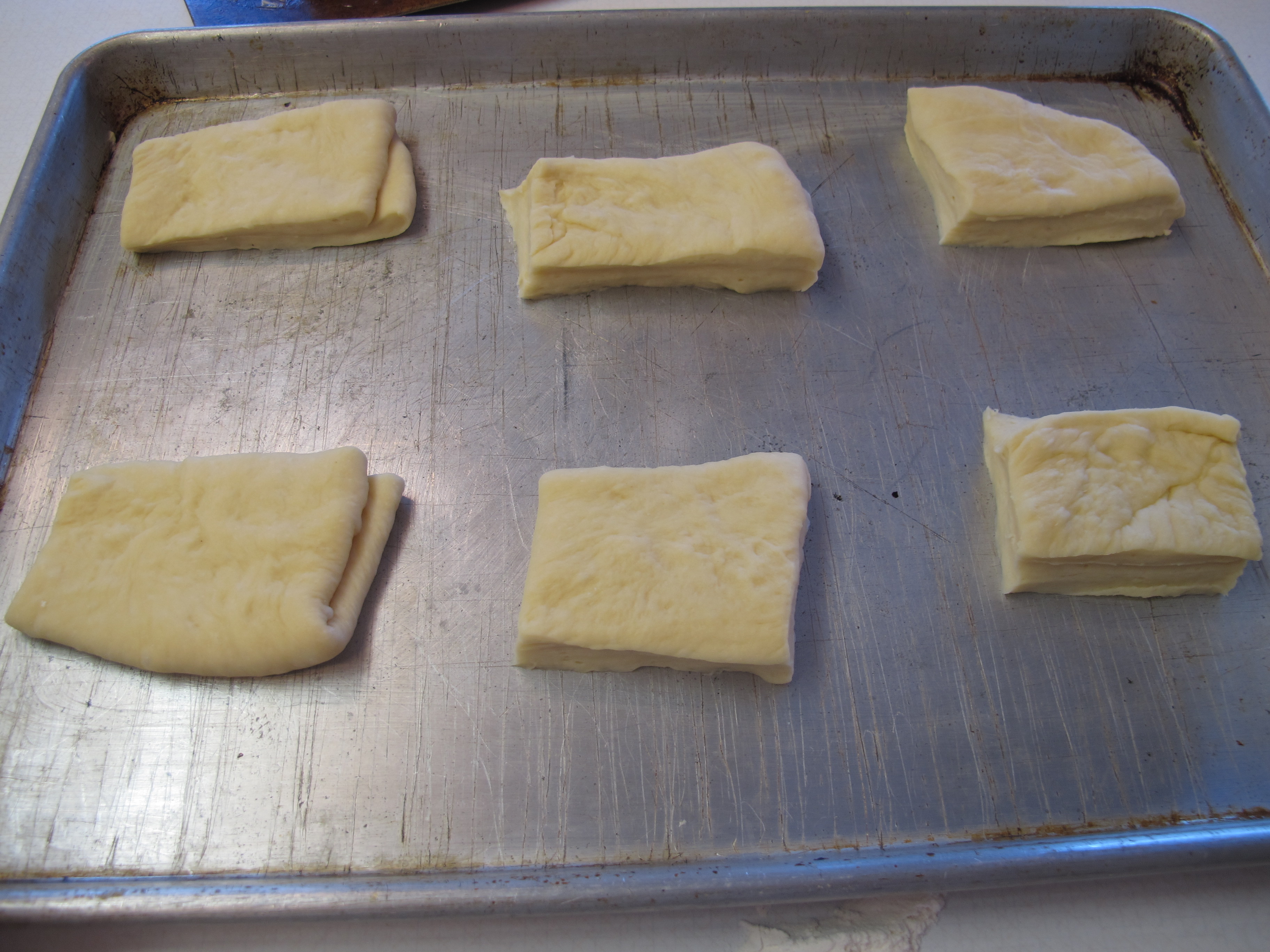 (To make the square ones – roll out the dough into a rectangle, about 1/2 inch thick, then fold the rectangle in half, making it about 1″ thick. Use your rolling pin and roll over the dough very gently, just to seal the two halves together. Then cut the rolls into squares or rectangles. This makes 12 big rolls.)