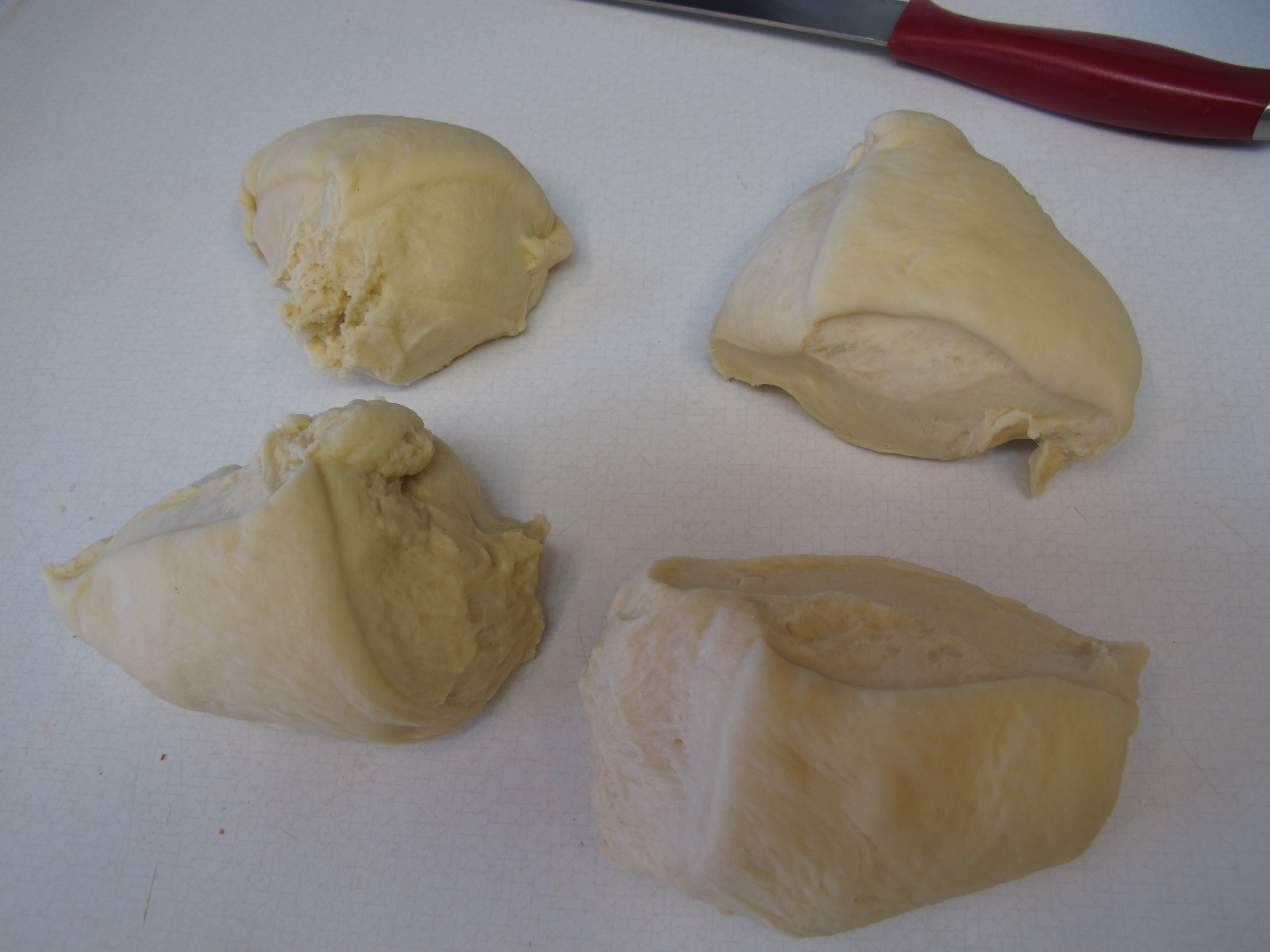 To make the round rolls: Divide dough into four even portions, and then divide those into 6 small portions. Fold the edges under to fold a smooth balls. Roll dough ball on the counter to smooth out the ball. This makes 24 small round rolls.