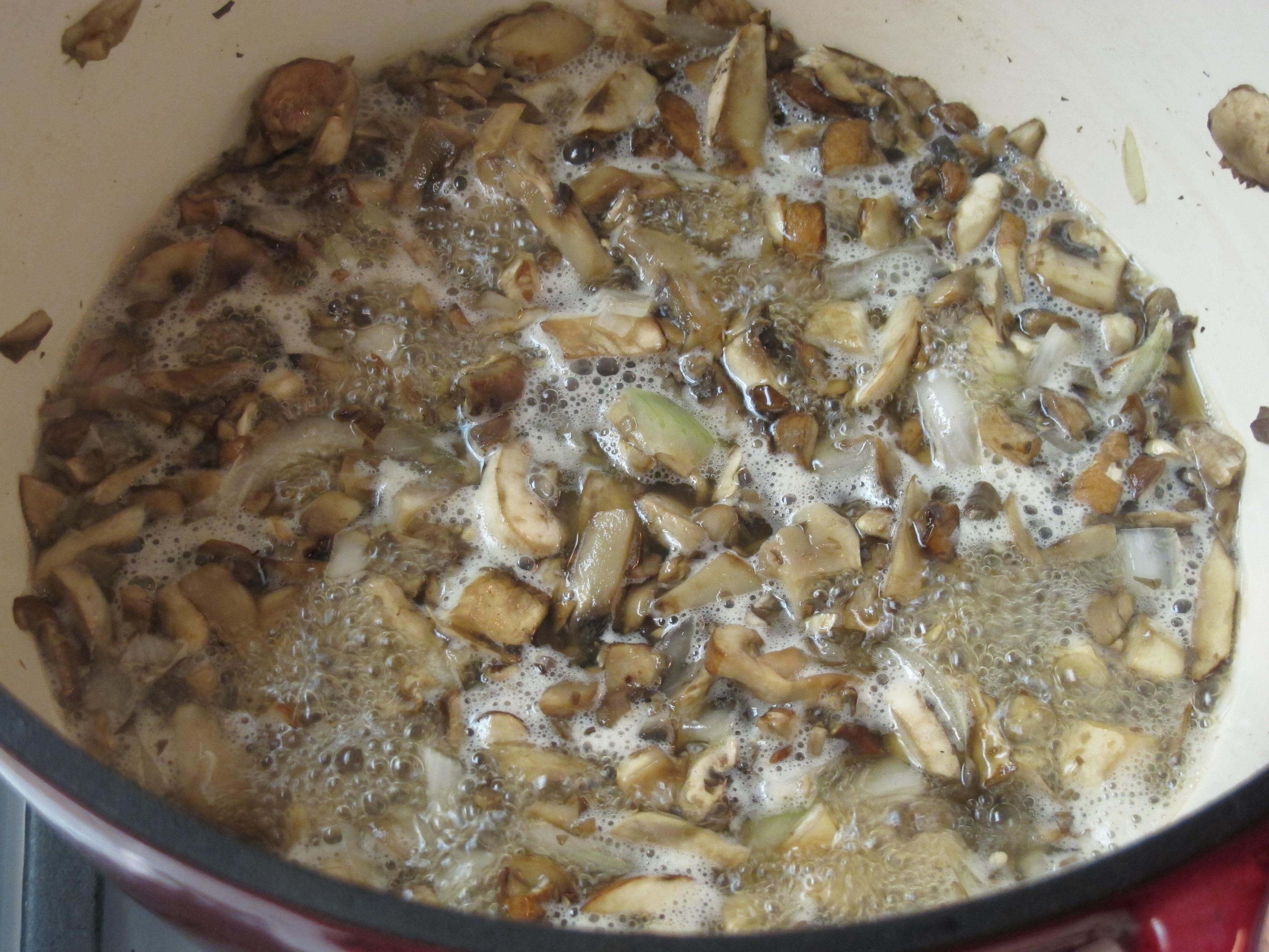 Give the mushrooms a rough chop. Mix mushrooms, broth, onions and thyme together in a pot or ceramic Dutch oven. Cook on medium/high heat for about 10 minutes until tender.