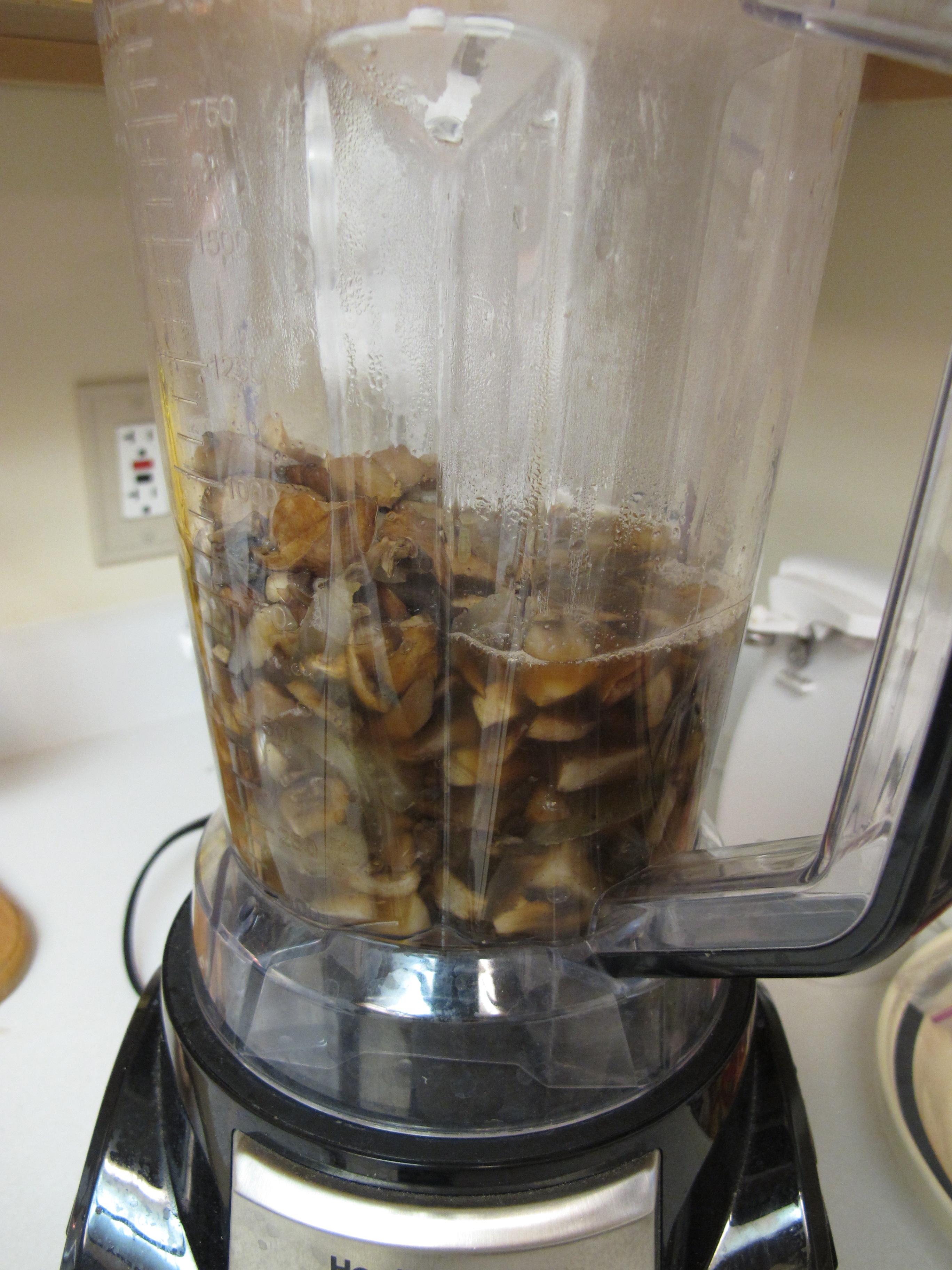 Put mushroom mixture in a blender and blend until smooth. Make sure the center part of the lid is off to let the steam escape.