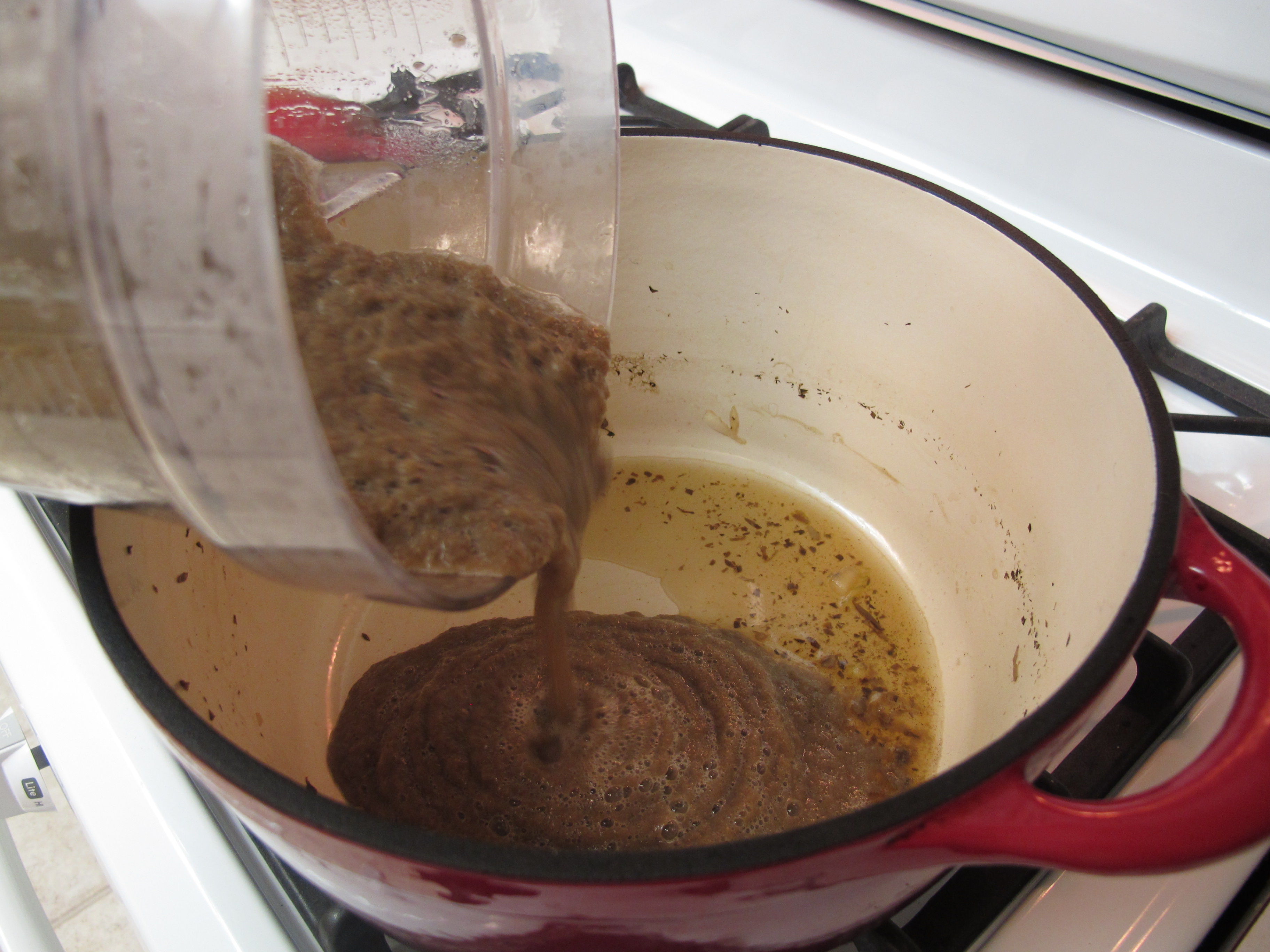 Put mushroom mixture in a blender and blend until smooth. Make sure the center part of the lid is off to let the steam escape. Put contents back in the pot when blended. If you want some chunks in your soup, only blend 1/2 or 3/4.