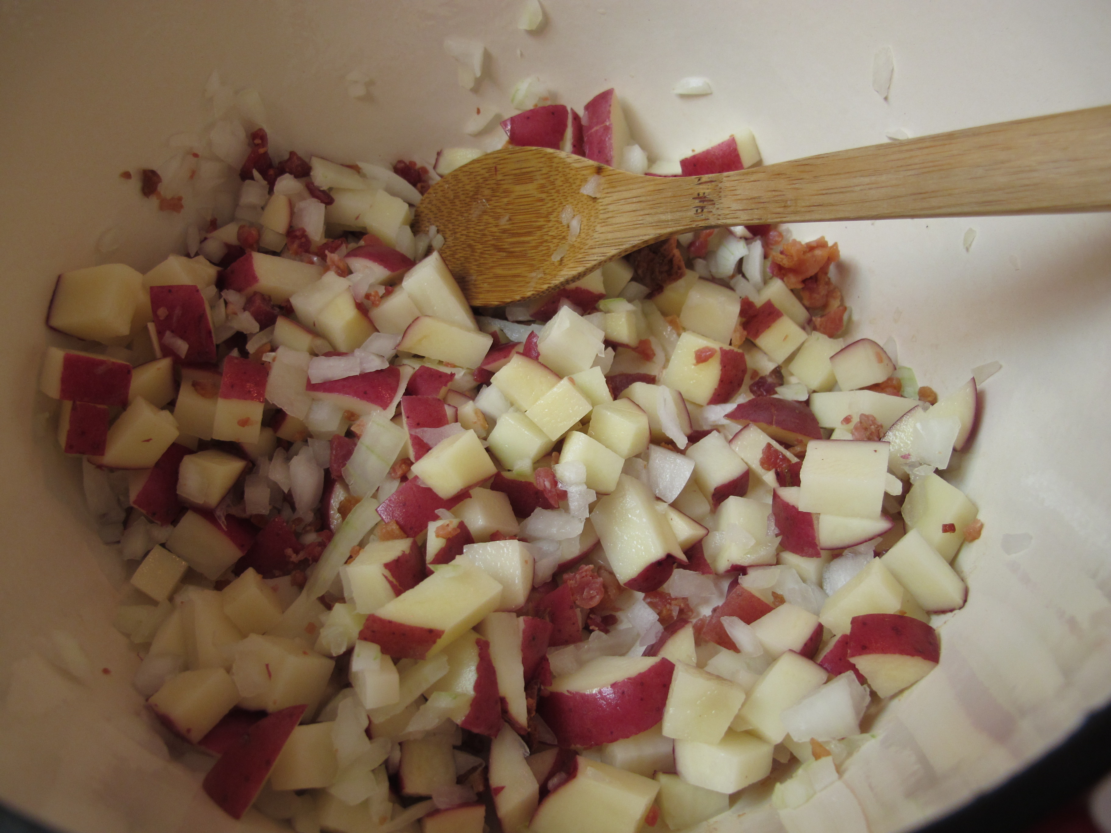 In stock pot, cook bacon, onion and potatoes. Cook until onions are translucent.