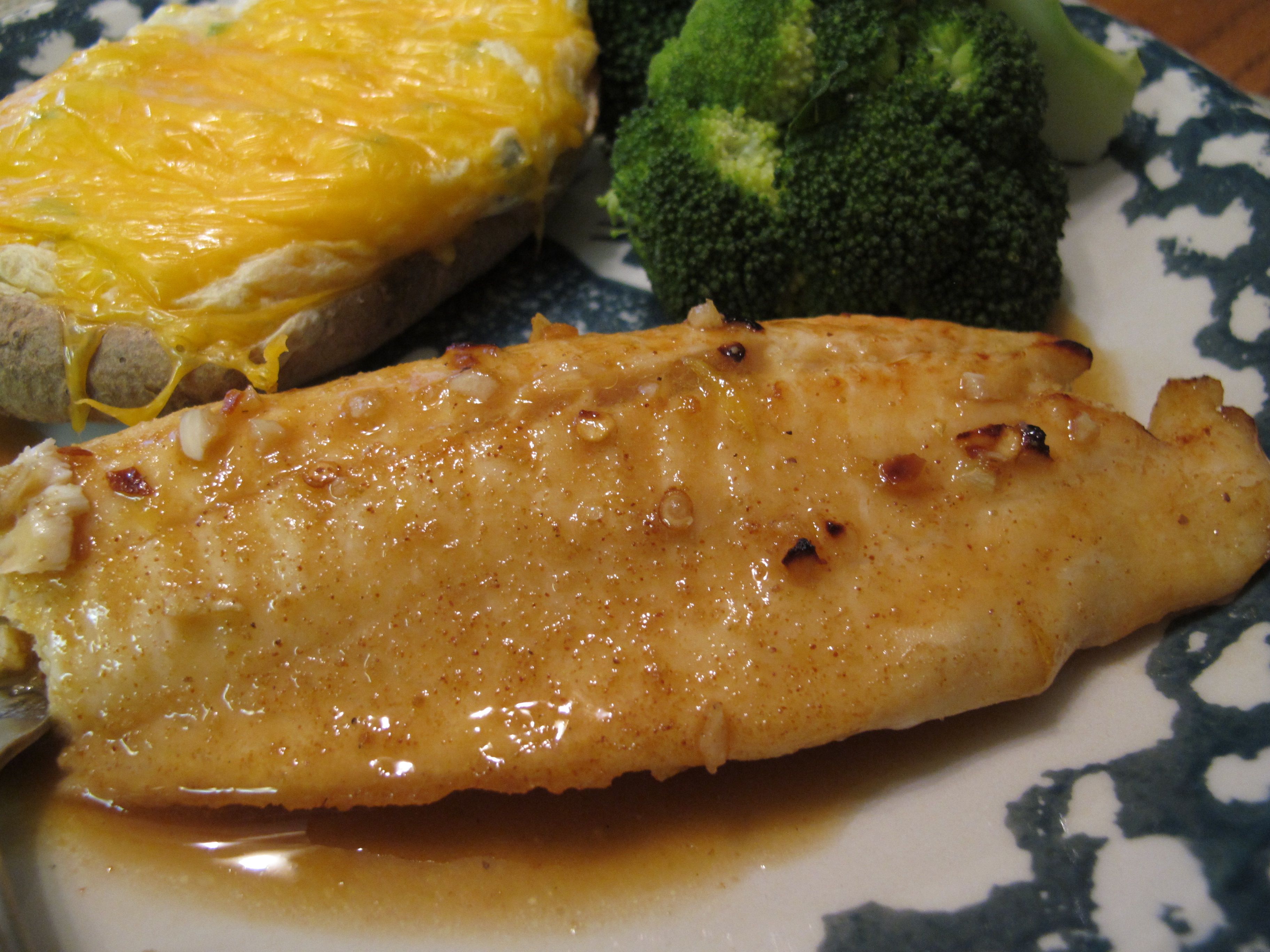 This tilapia has a hint of sweet citrus combined with just enough spice to give it favor. Makes for a quick meal since it only takes 15 minutes to cook. Served here with Twice Baked Potatoes and Broccoli.