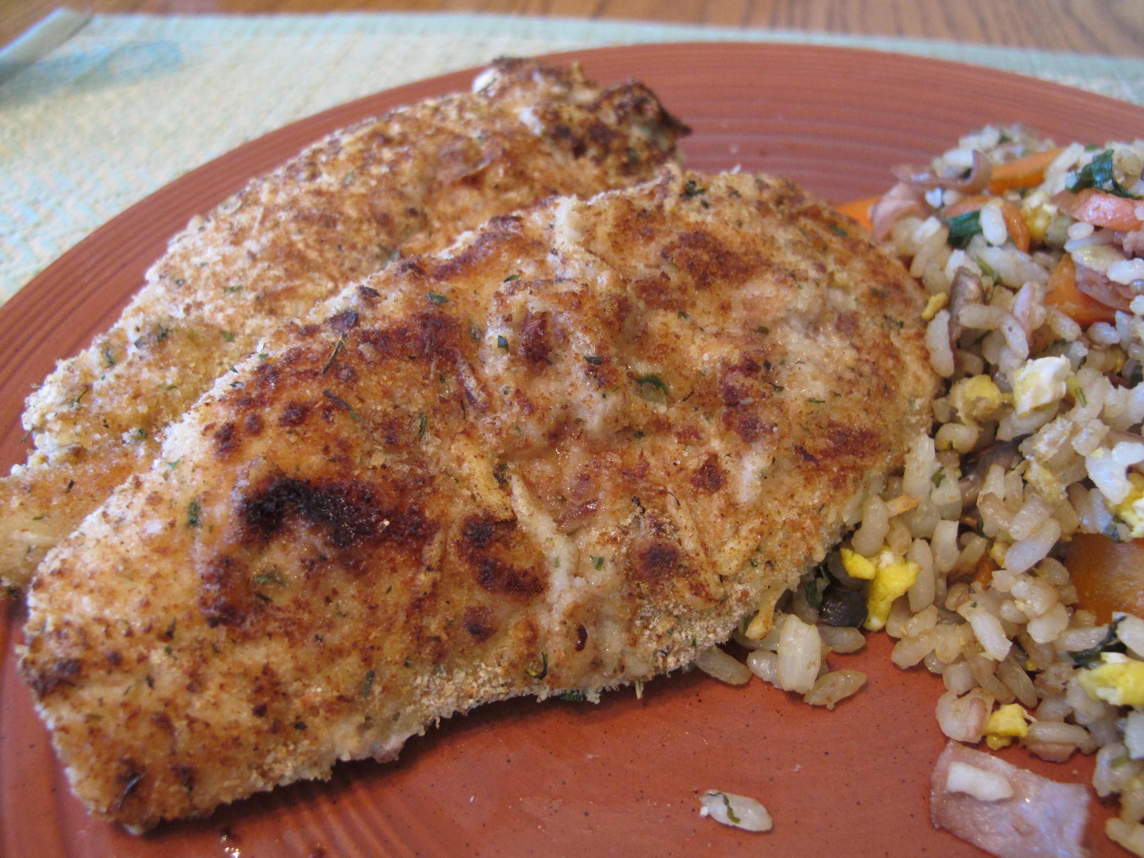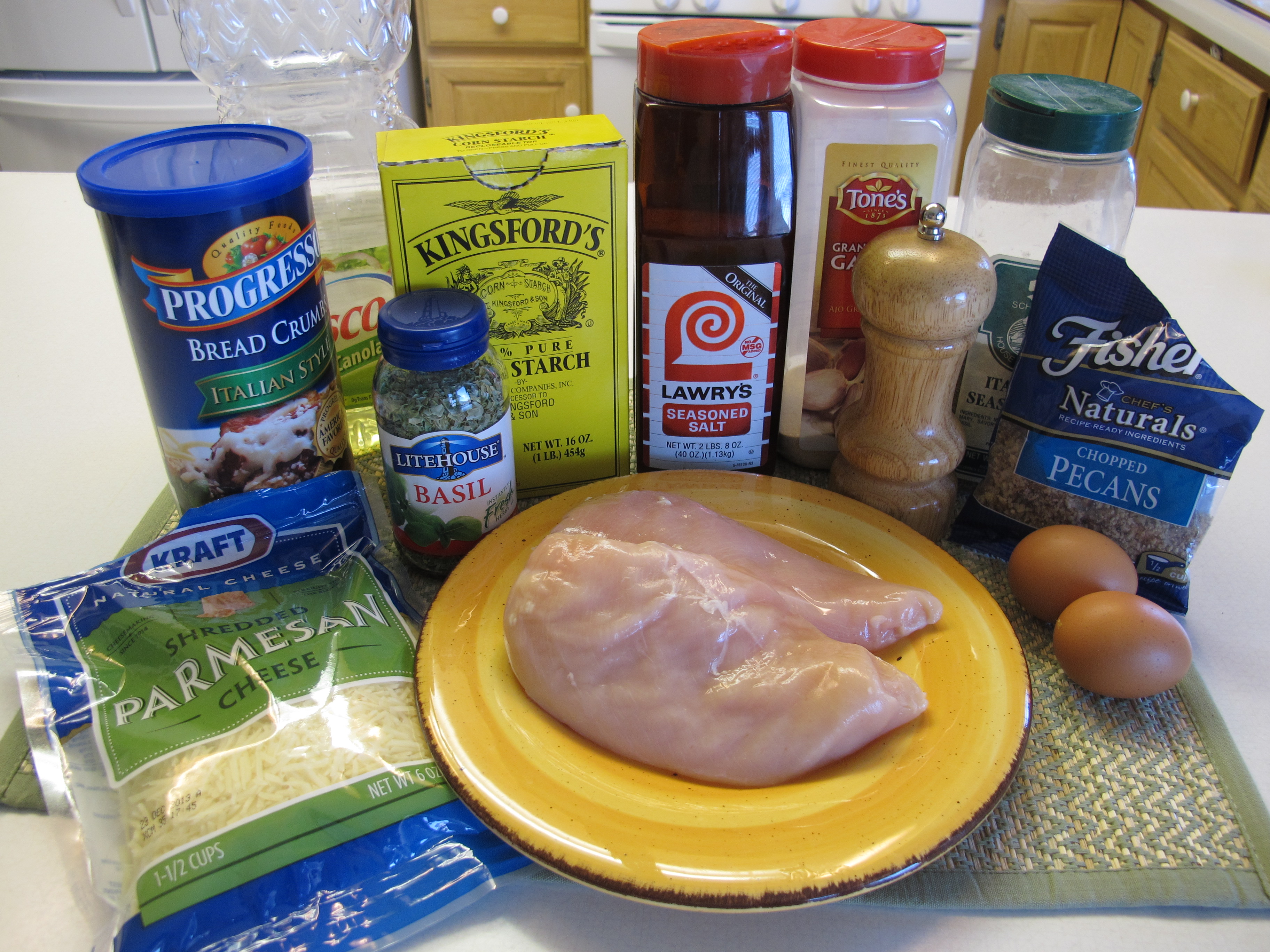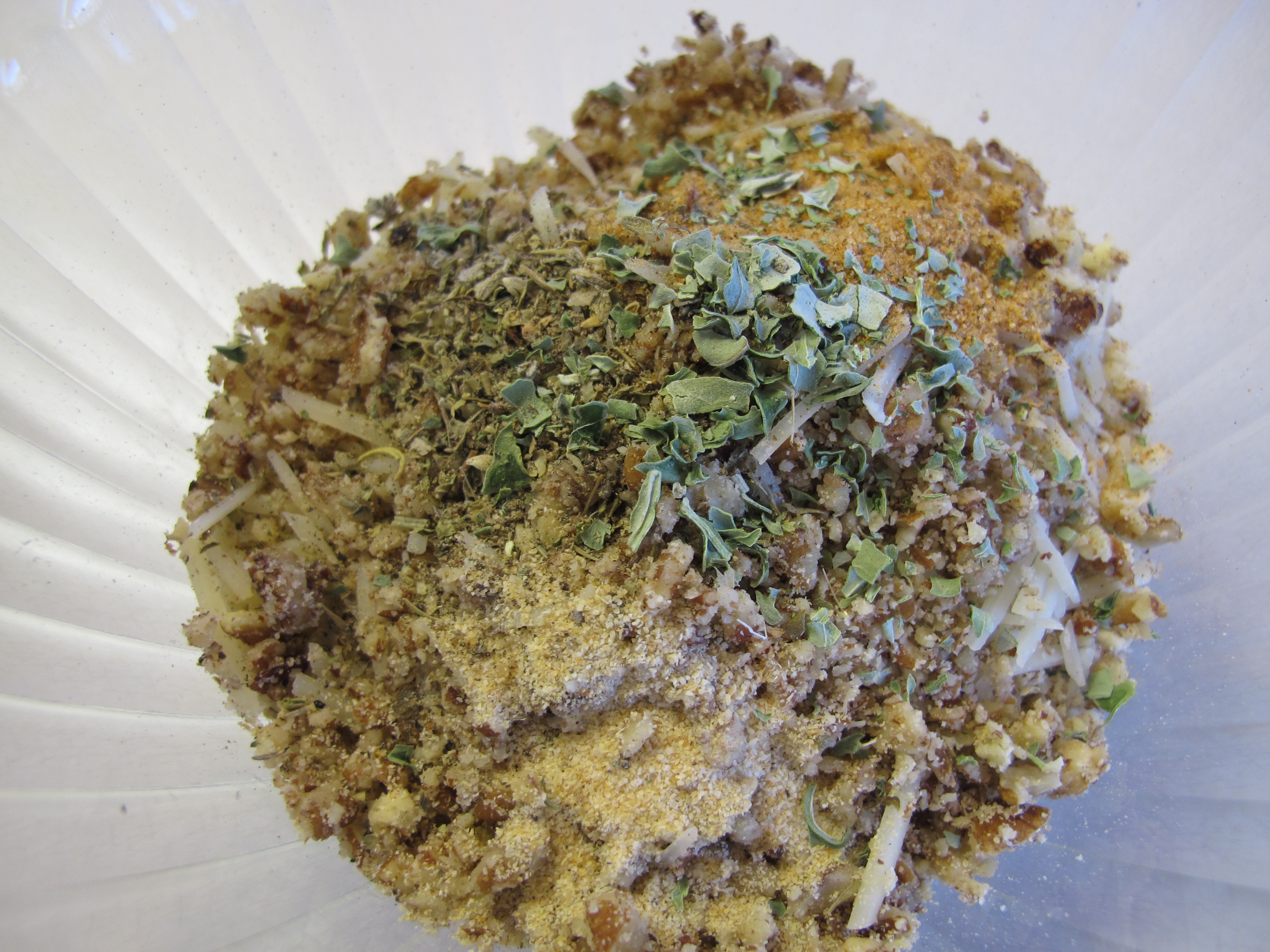 In a shallow bowl or pie plate, combine the breadcrumbs, parmesan cheese, pecans, italian seasoning, seasoned salt, garlic granules, basil and pepper.