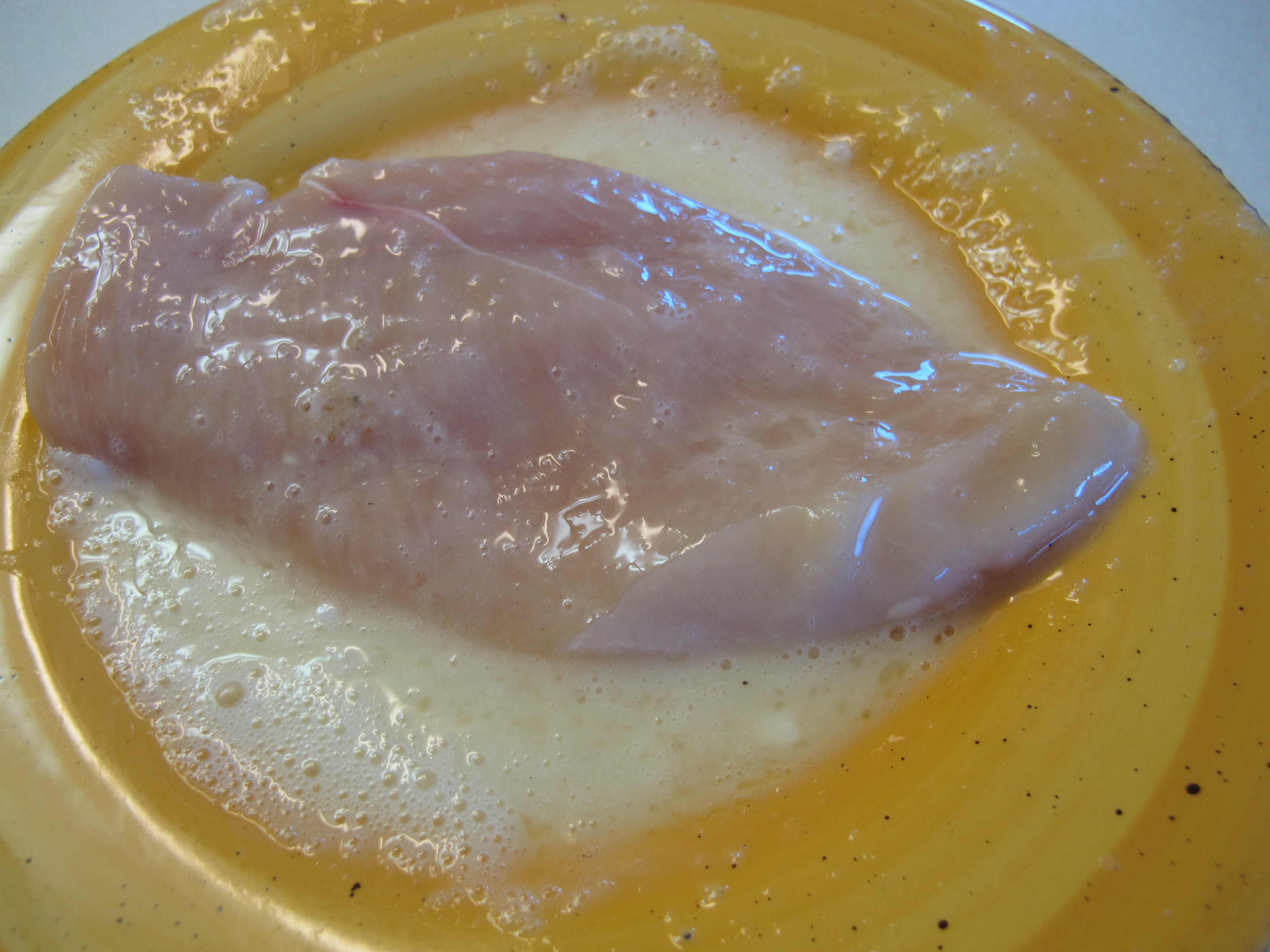 Dip each chicken piece into the egg mixture and then coat with crumb mixture.