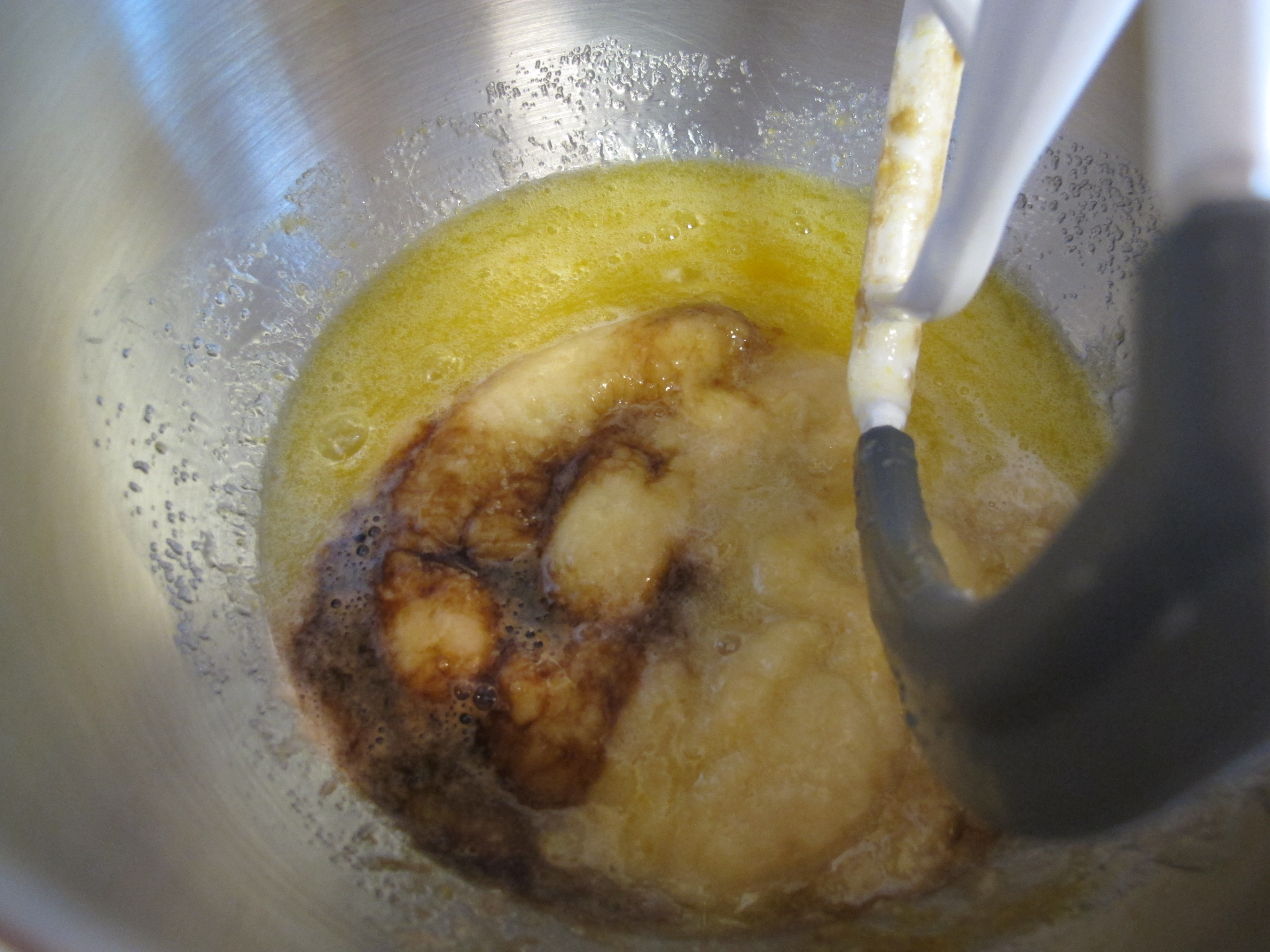 Beat in bananas and vanilla at low speed.