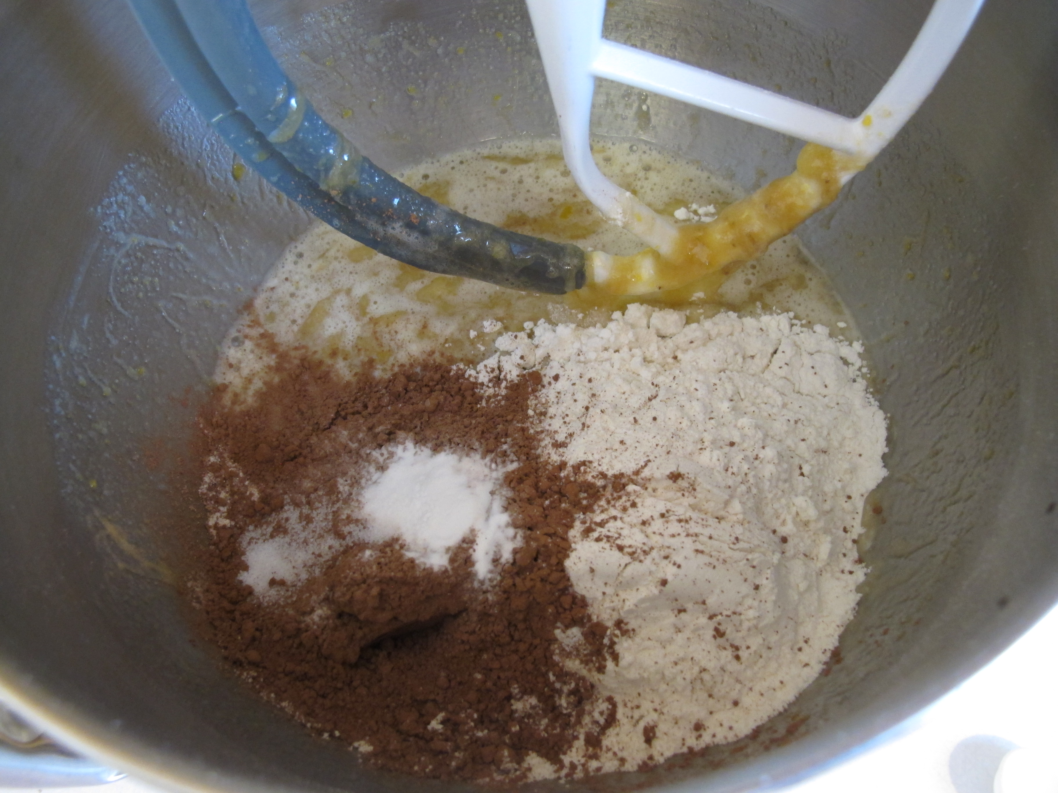 Beat in flour cocoa, baking soda and salt at low speed just until combined.