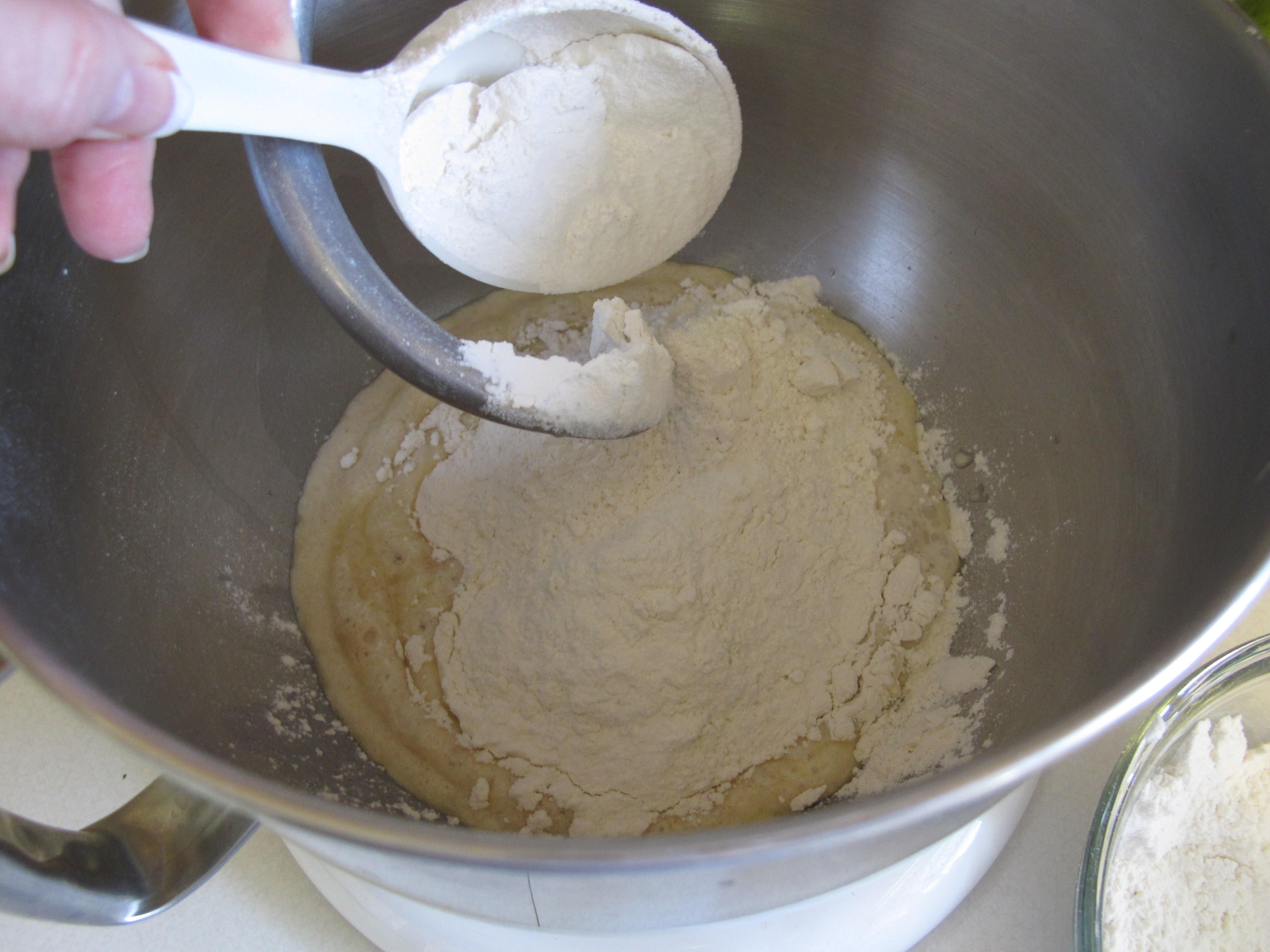 With mixer still going, add remaining flour, 1/2 cup at a time. Mix about 1 1/2 minutes, or until dough starts to clean the sides of the bowl.