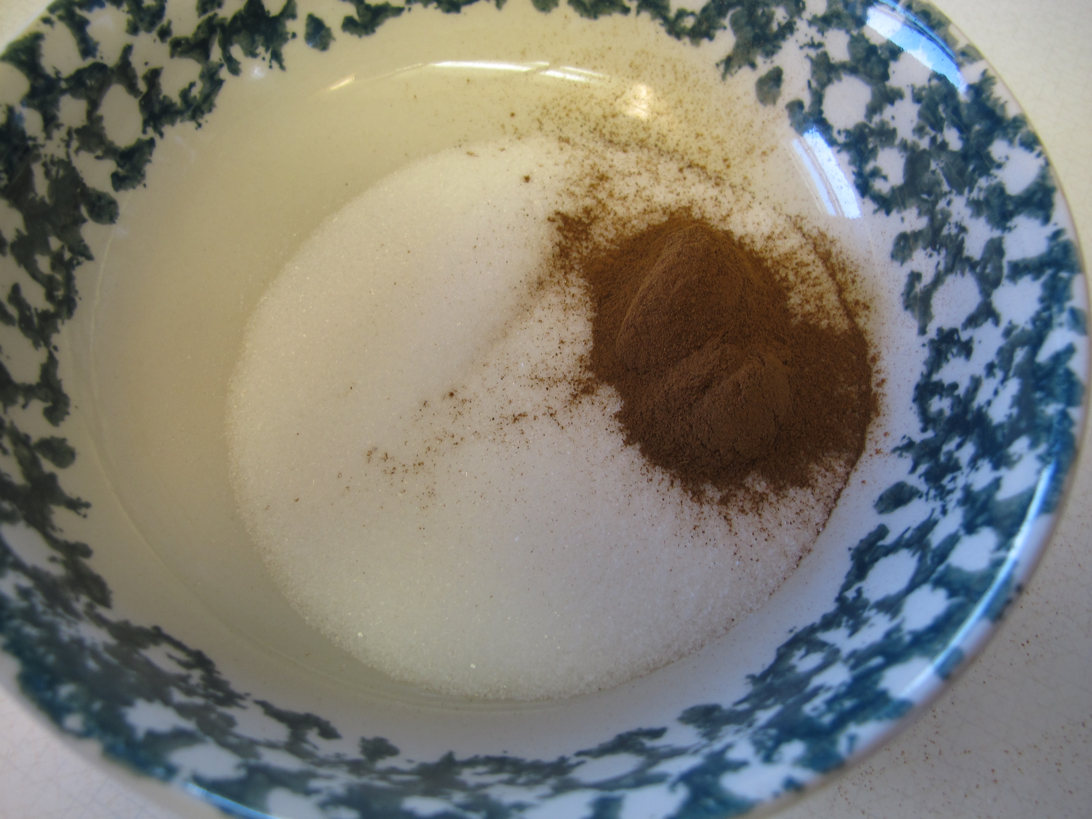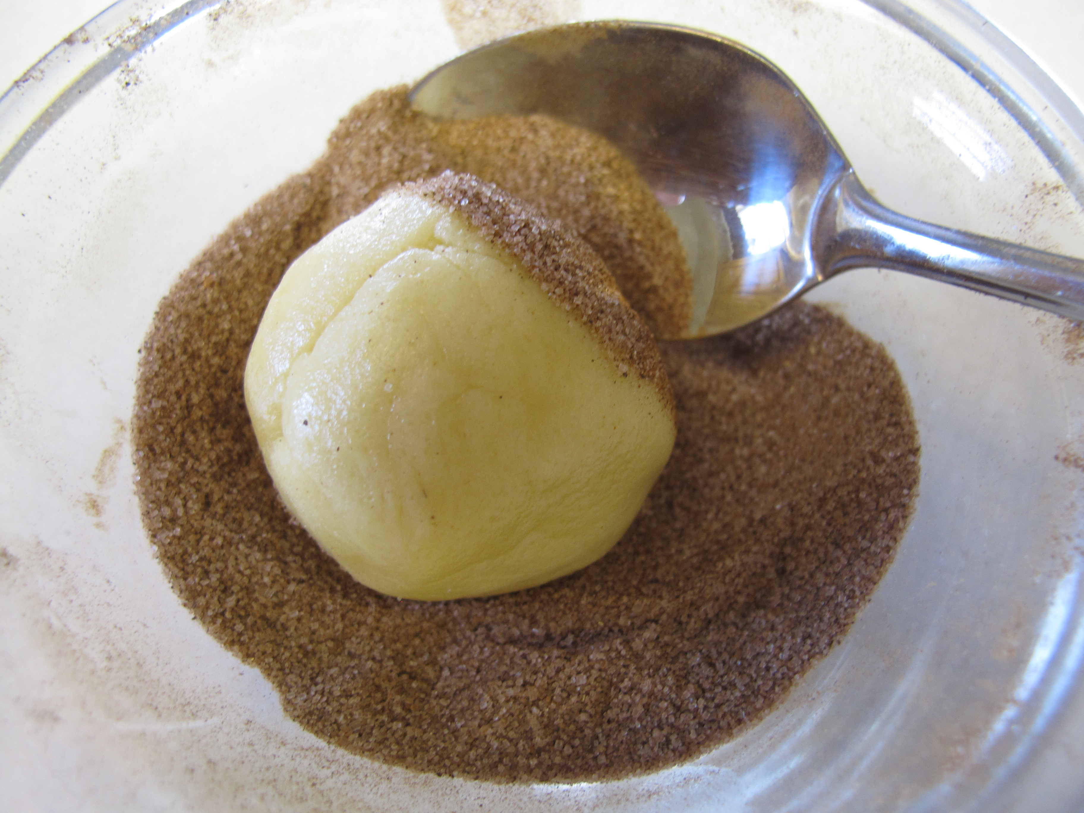 Roll the dough into balls and roll it around in the cinnamon sugar.