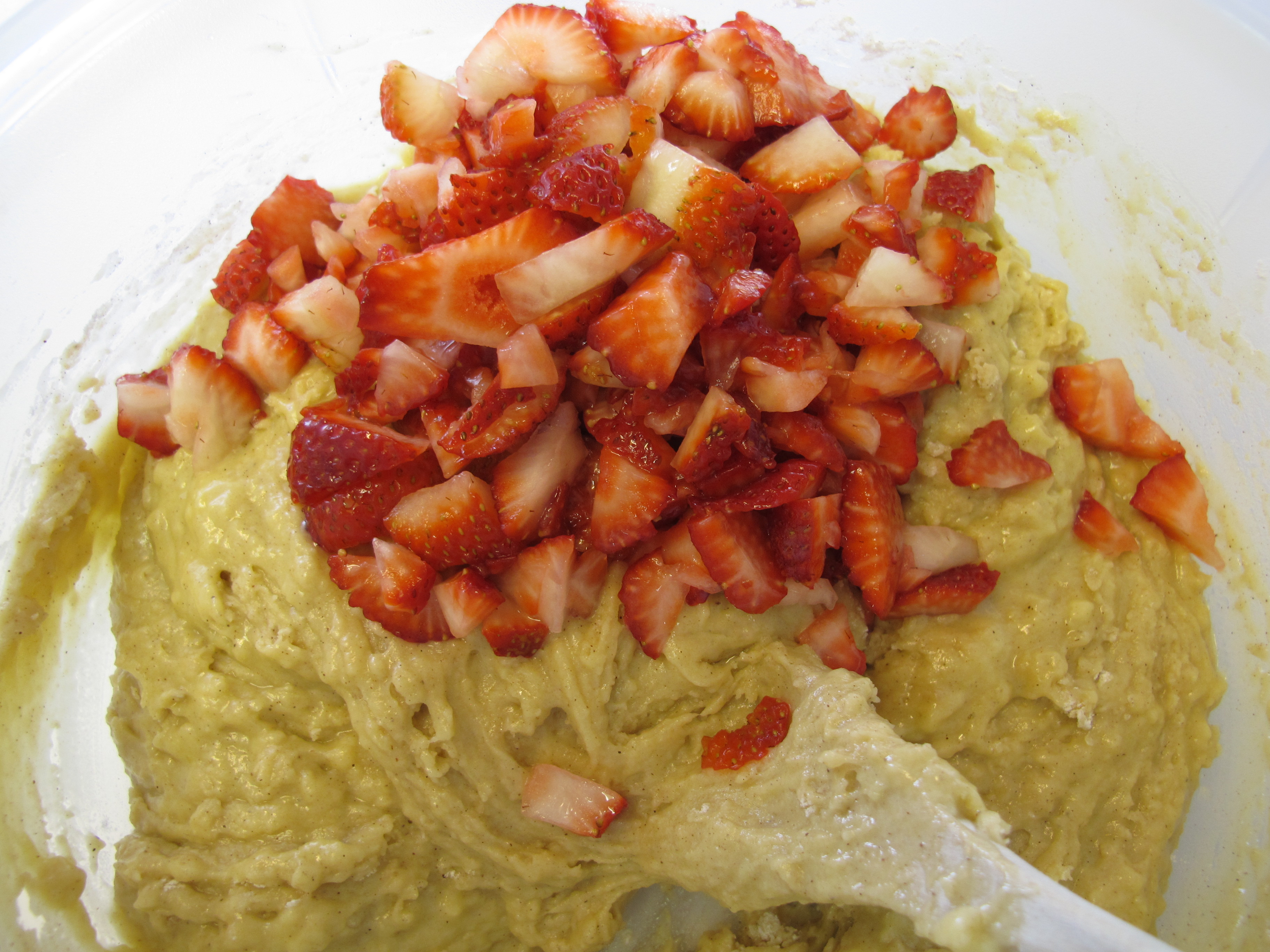 Roughly chop strawberries and fold into batter.