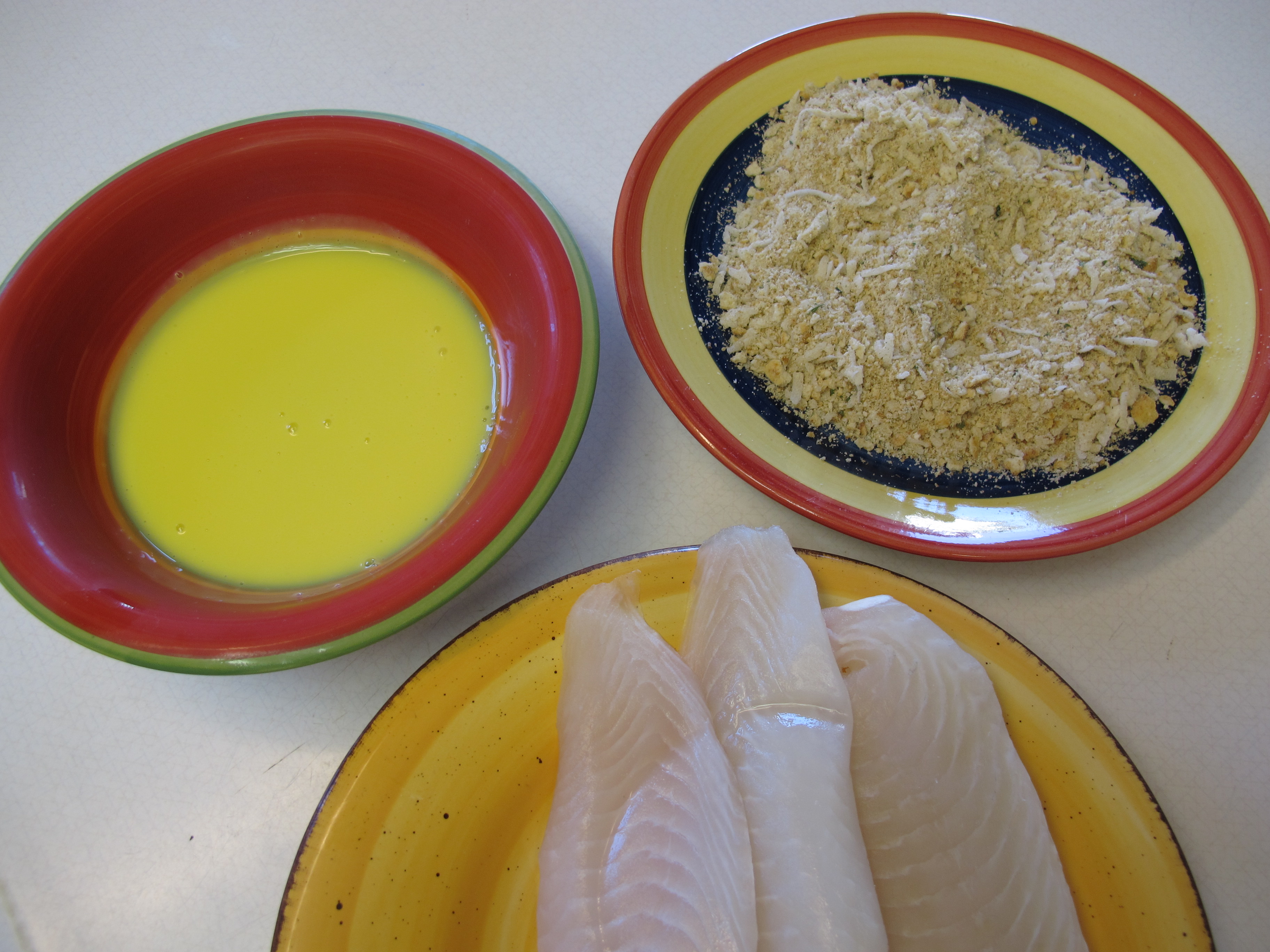 Dip the fish fillet in the egg, and then in the crumbs mixture.
