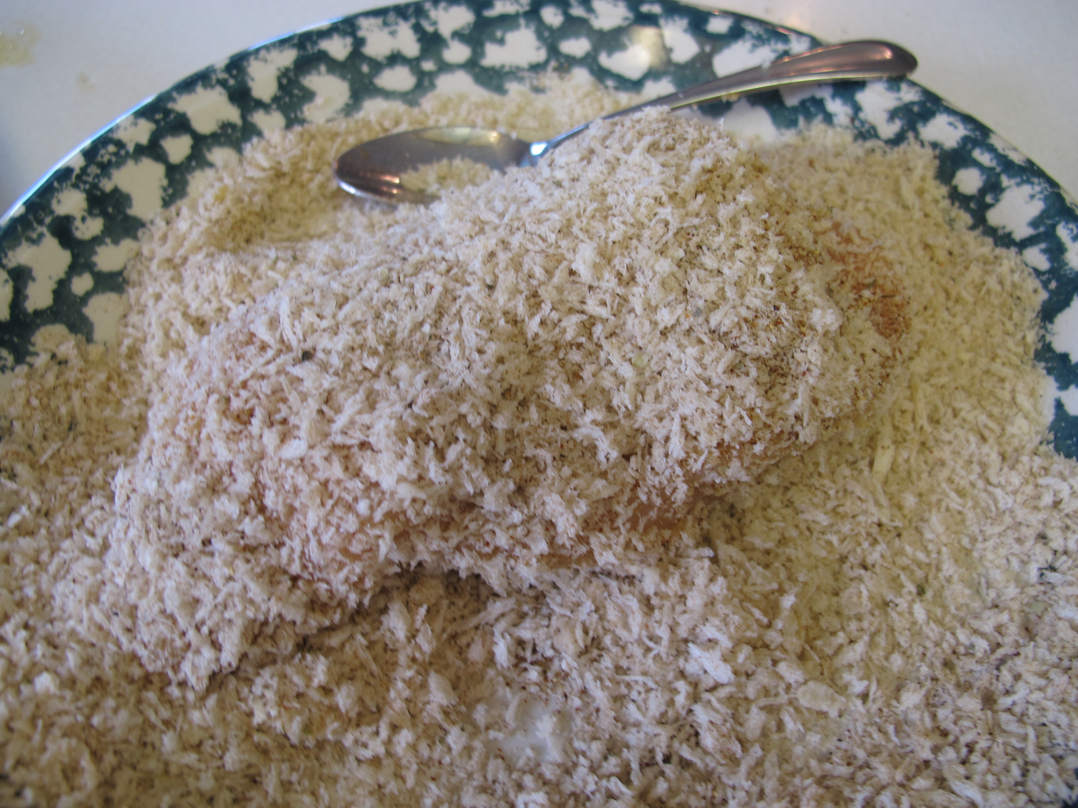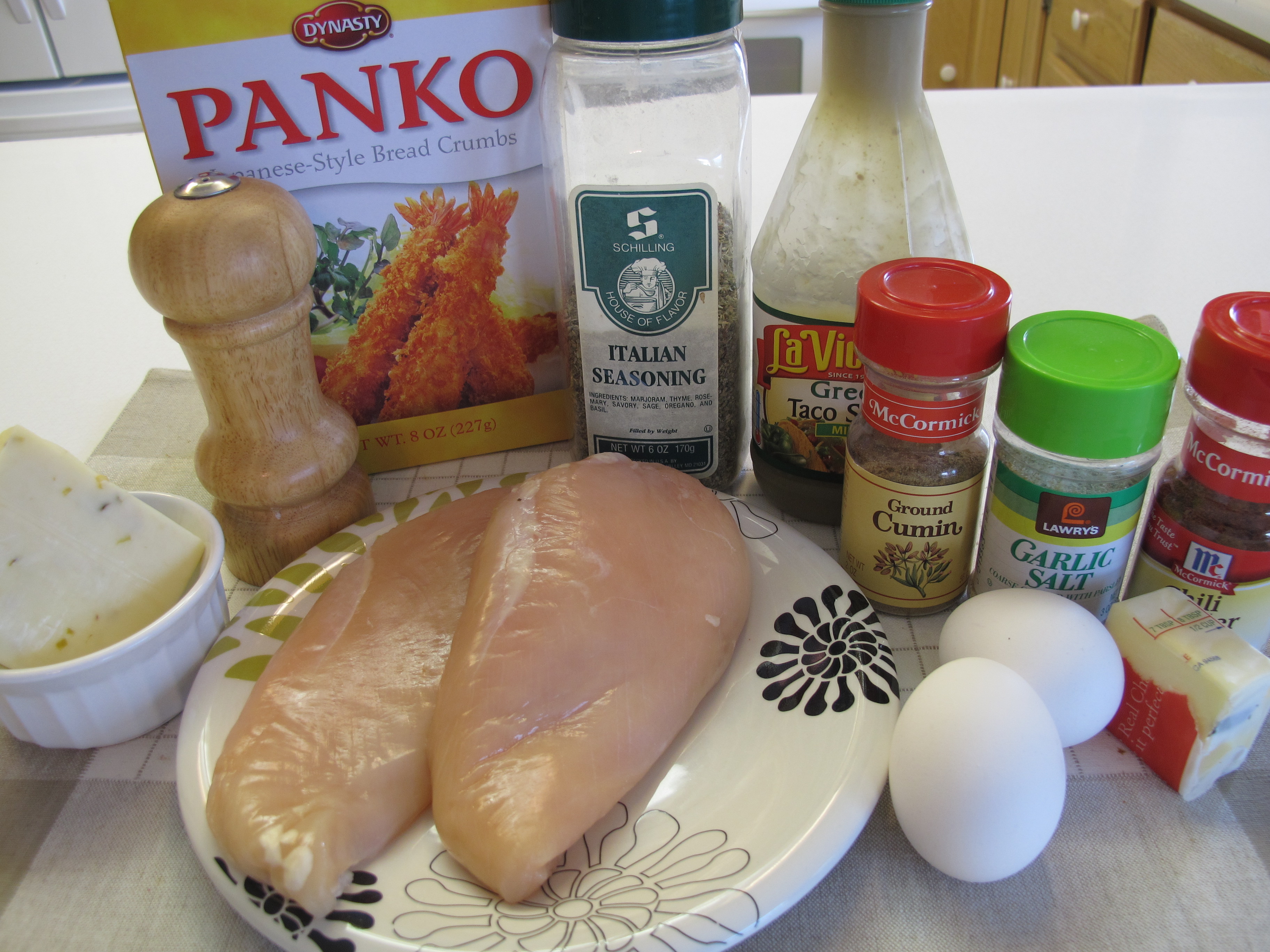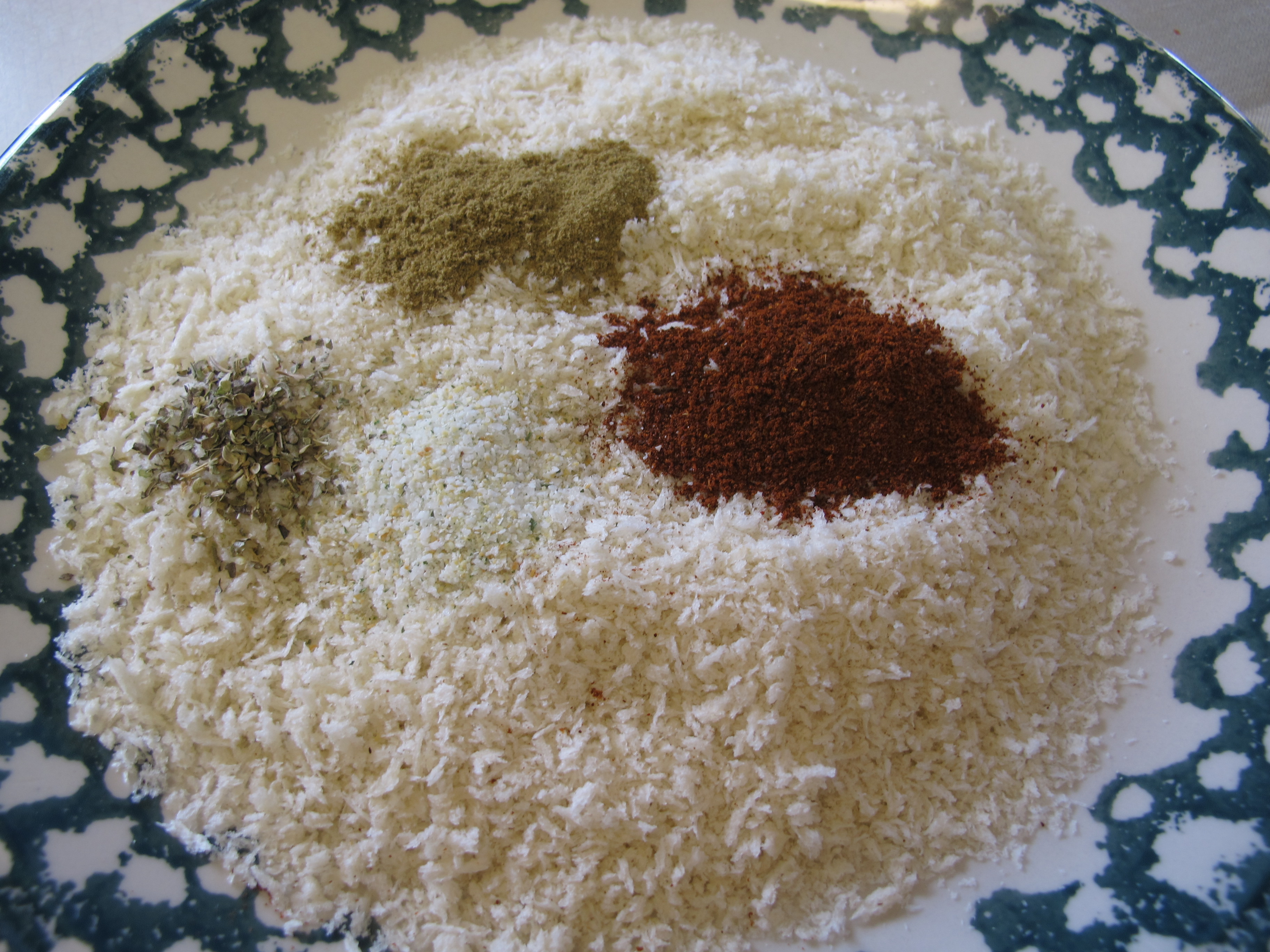 In a separate shallow pan, combine the panko breadcrumbs, chili powder, garlic salt, and oregano or italian seasoning.