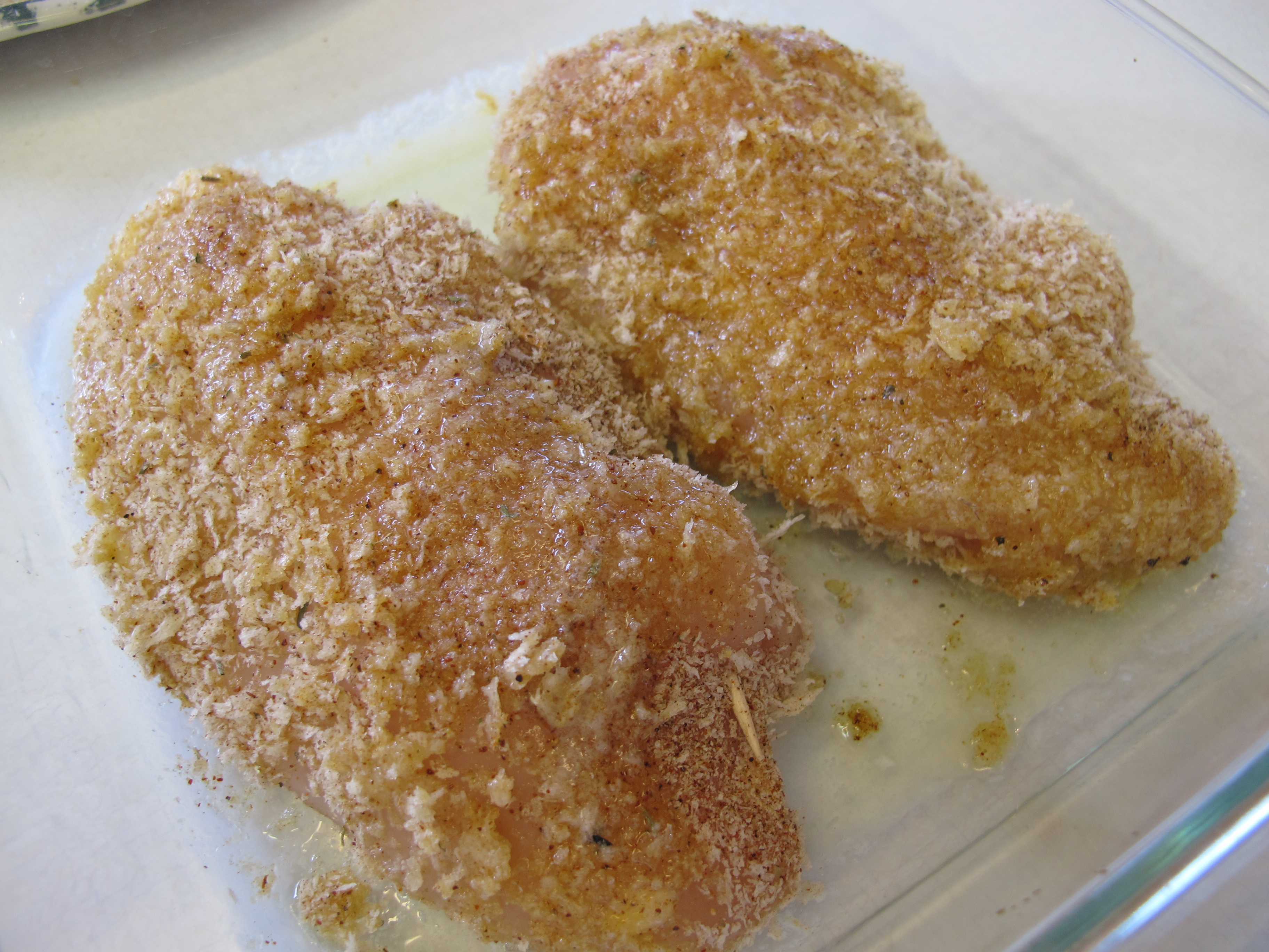 Prepare chicken and then place breaded chicken breasts in a shallow baking pan.