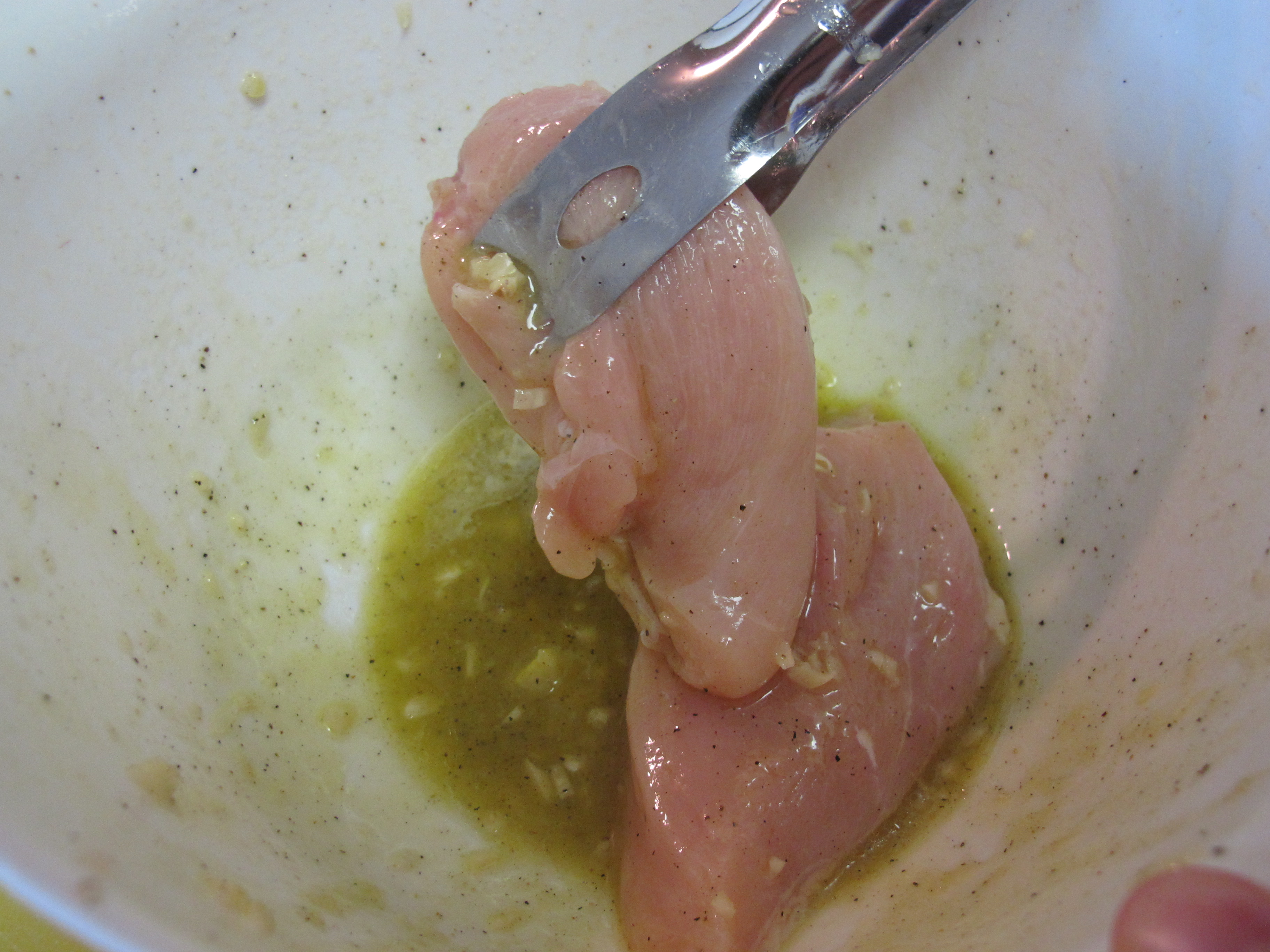 Place the chicken in the same bowl with the olive-oil mixture and coat thoroughly.
