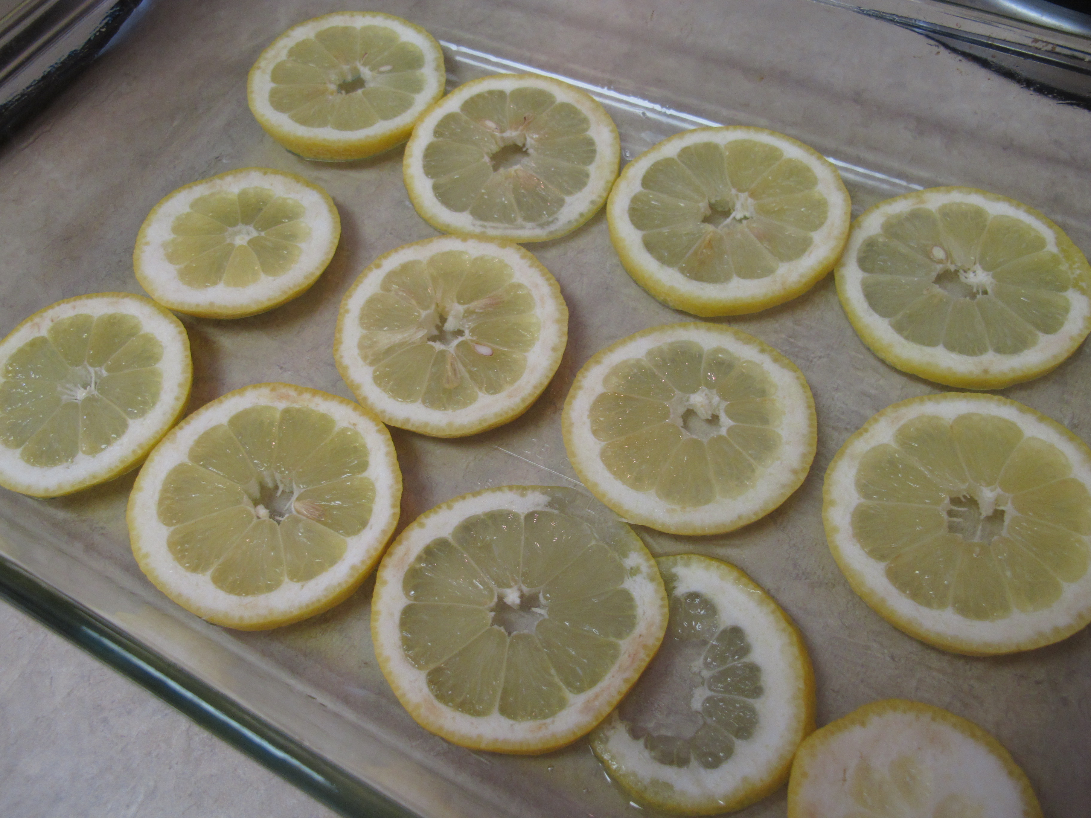 Arrange the lemon slices in a single layer in the bottom of the dish.