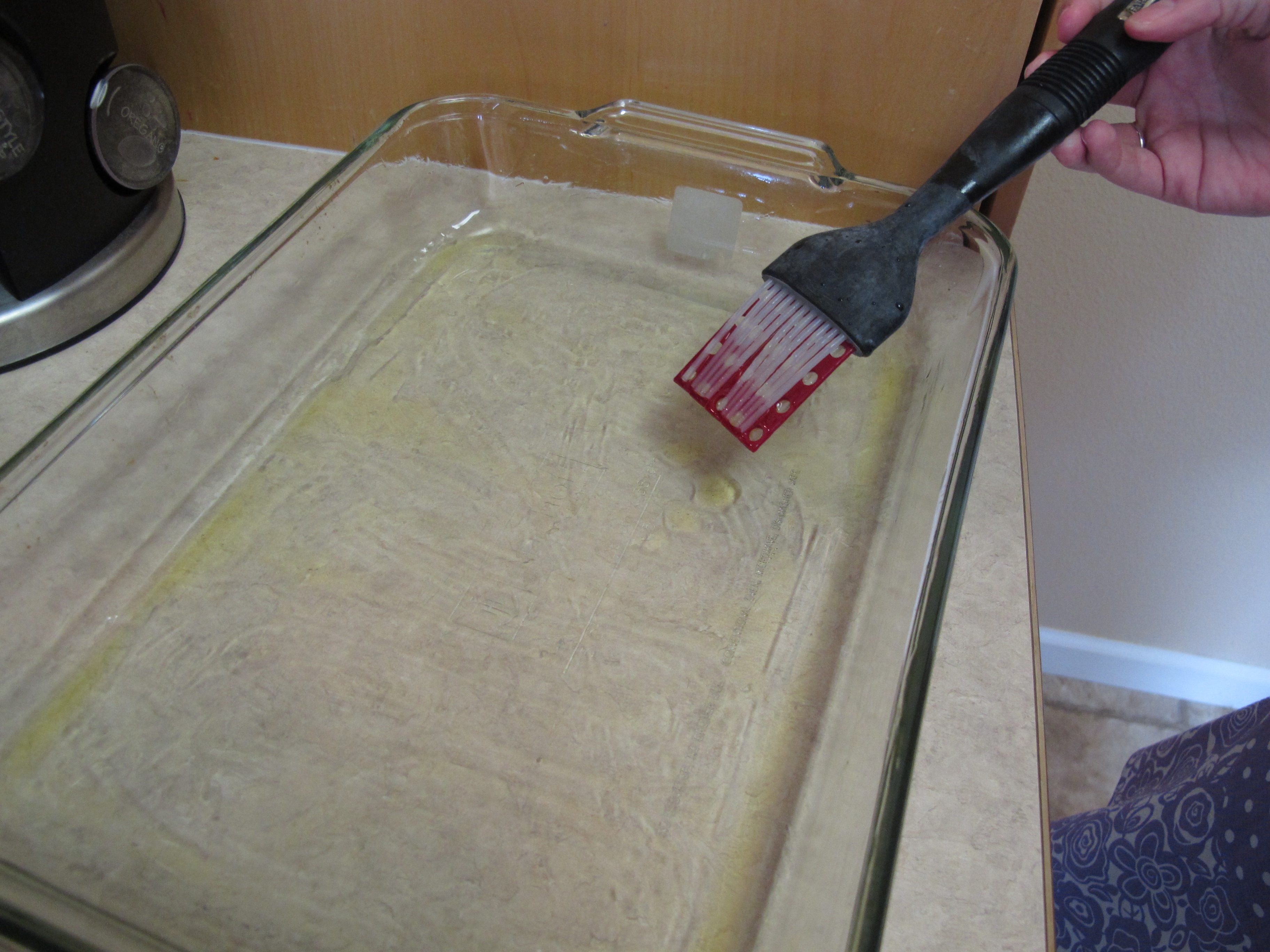 Melt butter in a glass 9 x 13 inch baking dish. Distribute evenly.