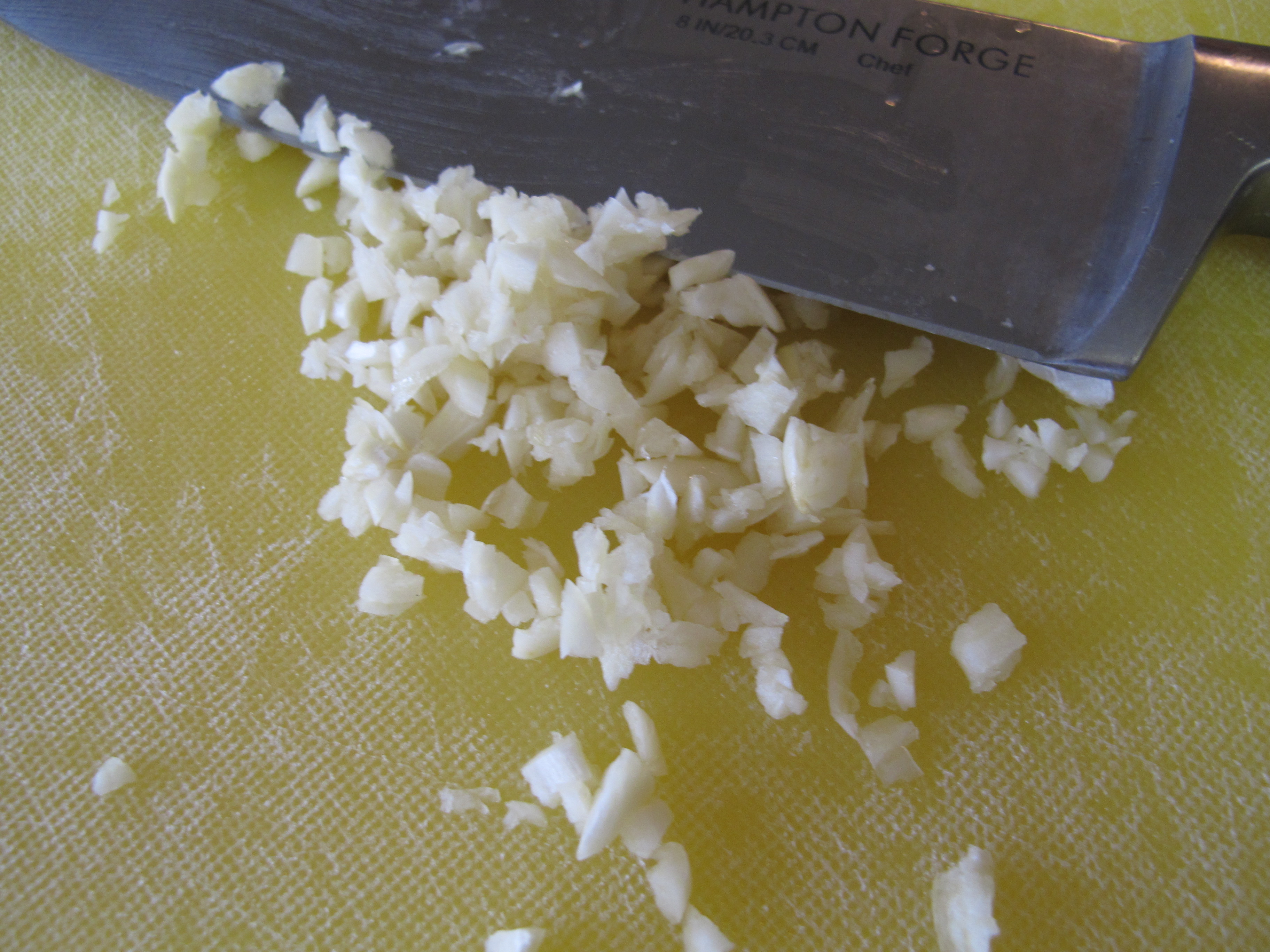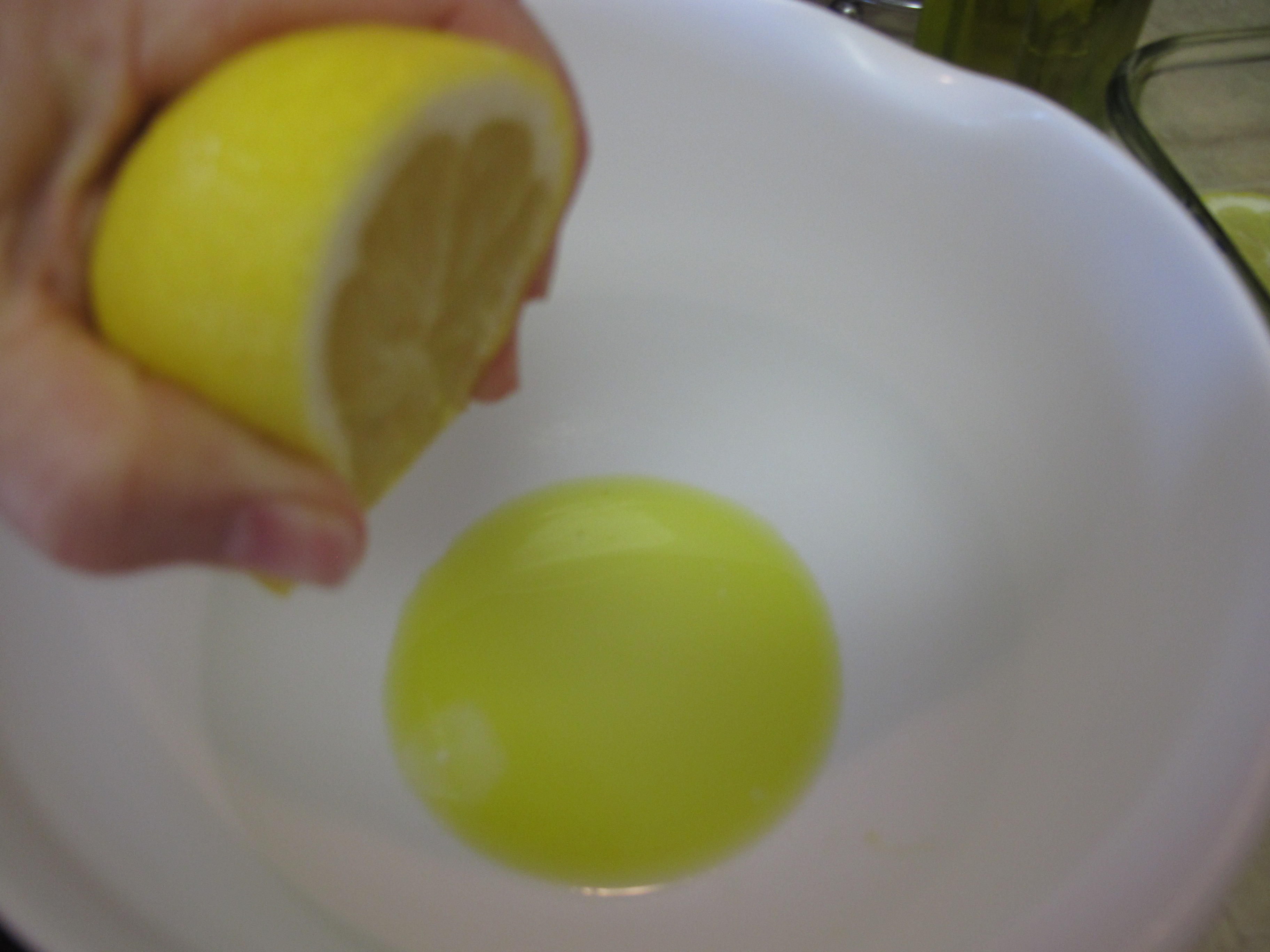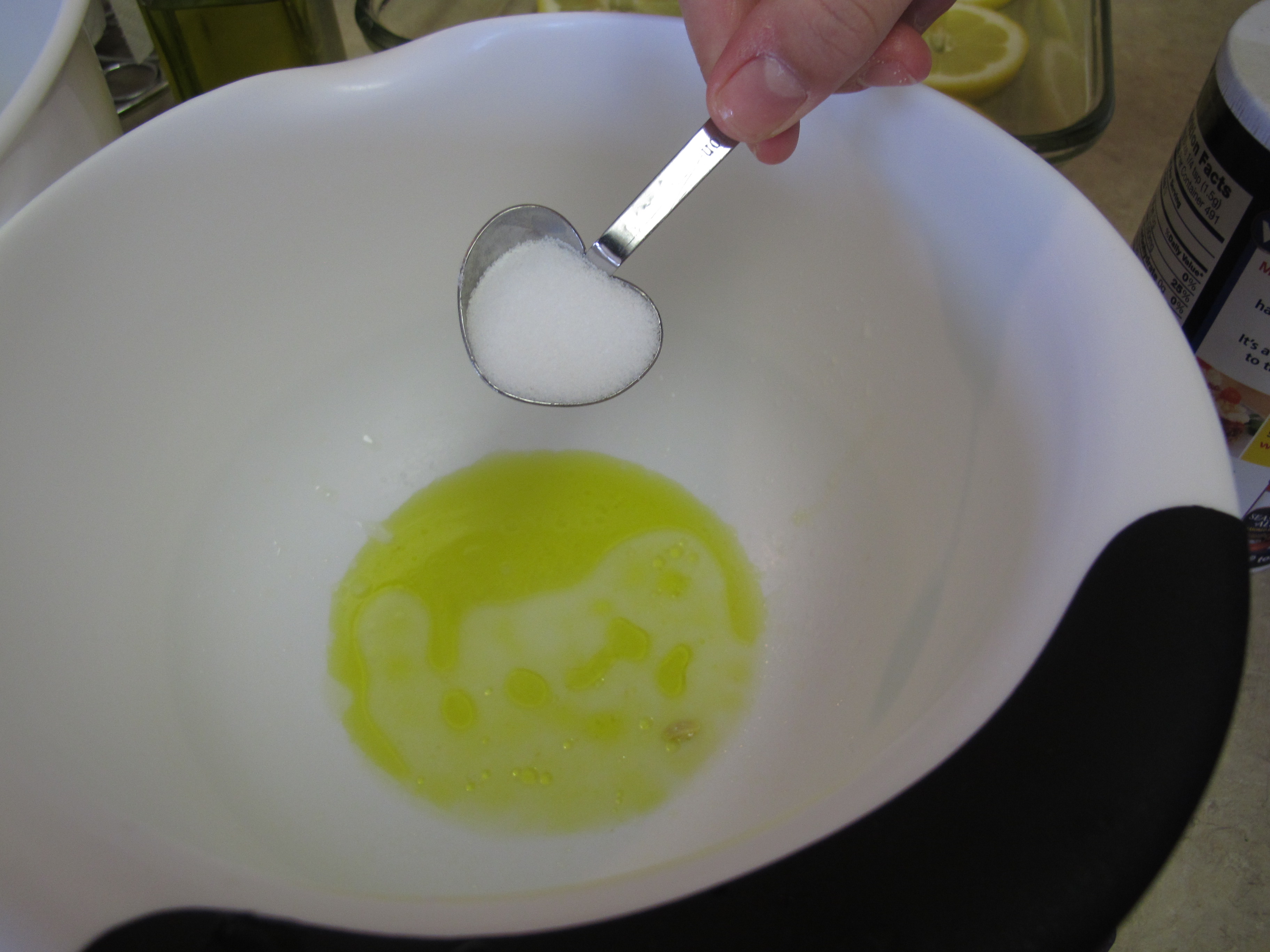In a large bowl, combine the remaining oil (5 T.), lemon juice, salt, pepper and garlic.